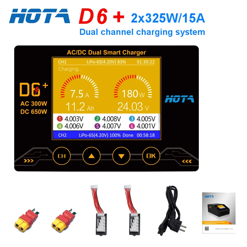 HOTA D6 + Plus AC 300 Вт DC 2X325W 2X15A Двухканальное умное зарядное устройство Dis зарядное устройство Lipo зарядное устройство для радиоуправляемого дрона запасные части