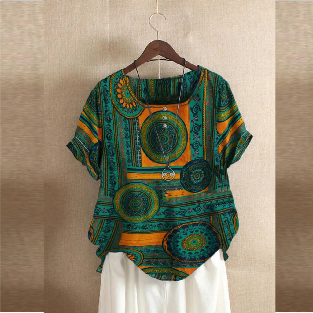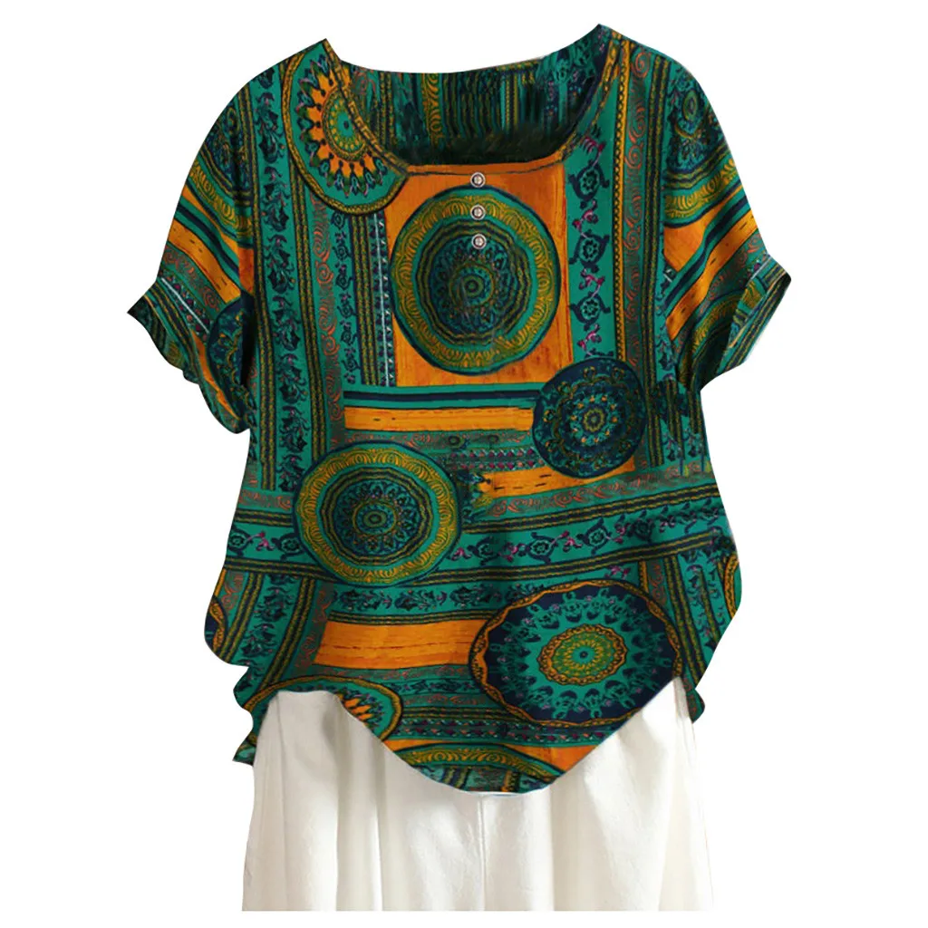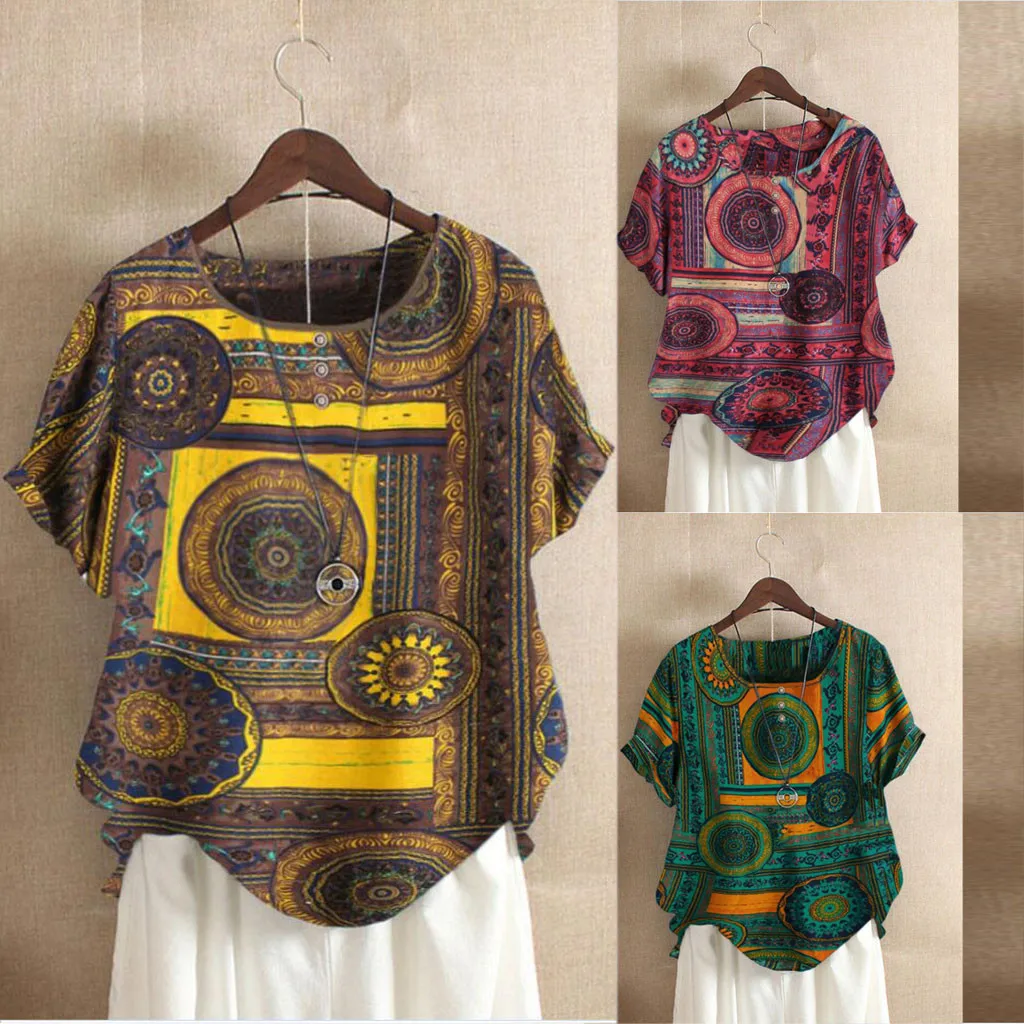 Размера плюс Топ женский с принтом одуванчиков, Повседневная льняная рубашка с коротким рукавом и круглым вырезом, из хлопка и льна, на лето