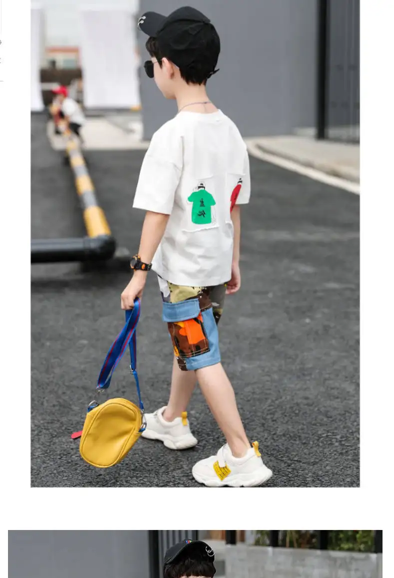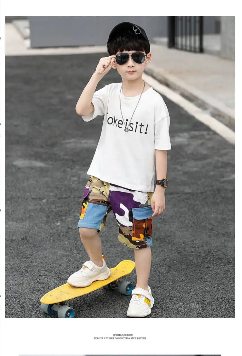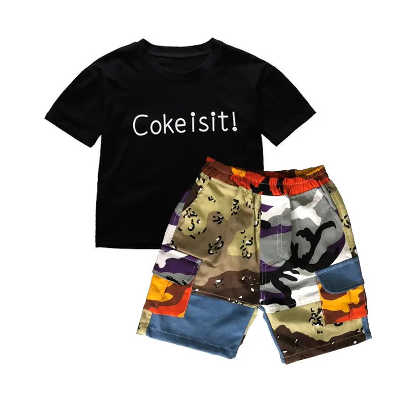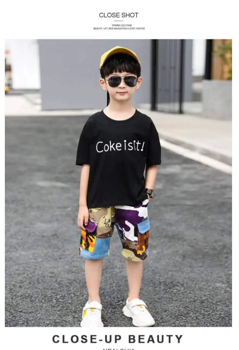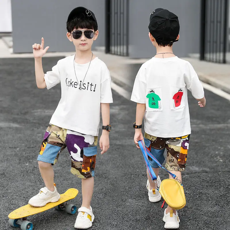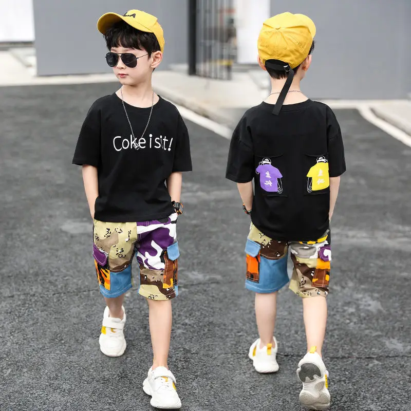 От 4 до 14 лет, одежда для мальчиков, летний комплект одежды 2021 Новый с О-образным вырезом с коротким рукавом модный пэчворк с буквенным принтом комплект одежды высокого качества