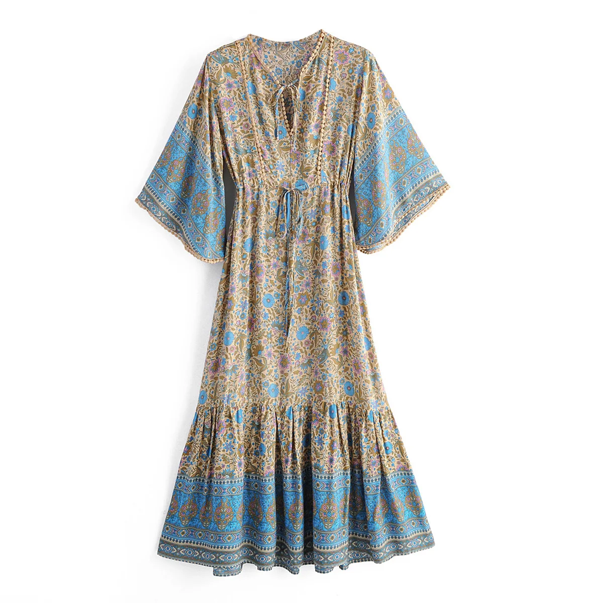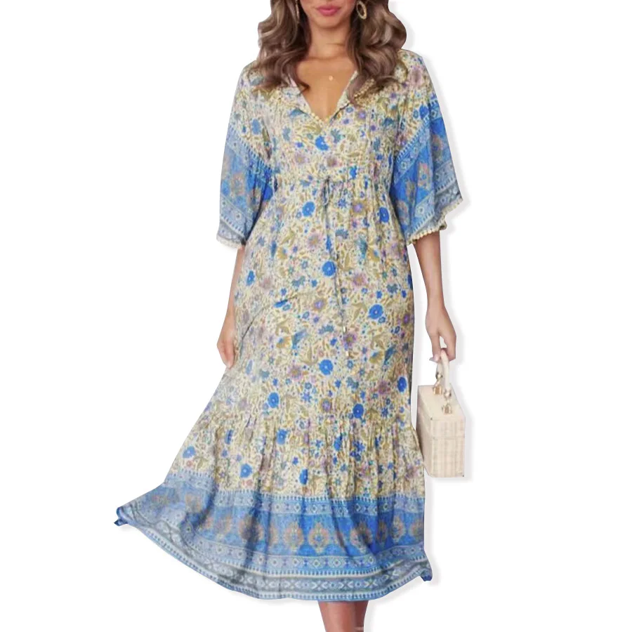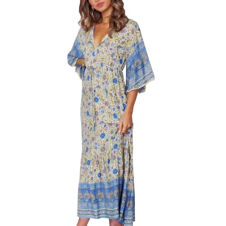 Женское платье миди TEELYNN Bohemia, винтажное Хлопковое платье с цветочным принтом, повседневное пляжное платье с расклешенными рукавами, модель 2020