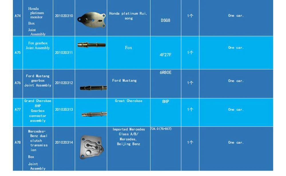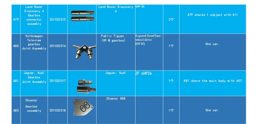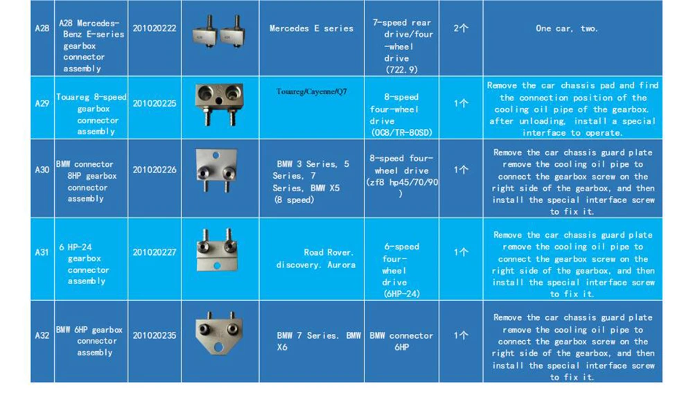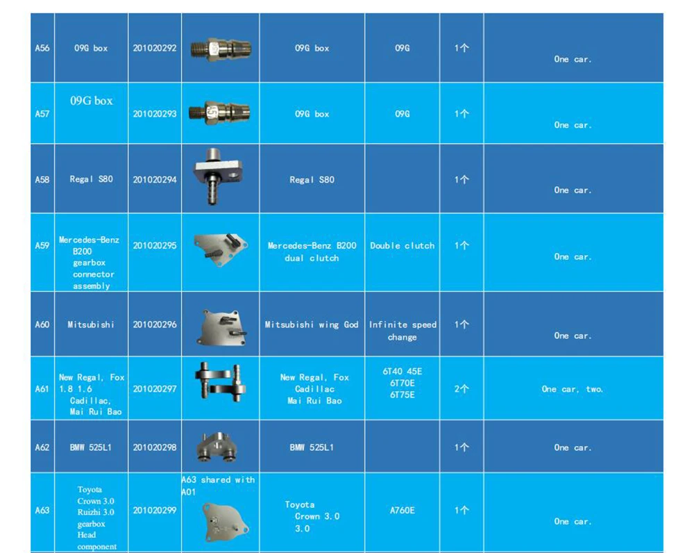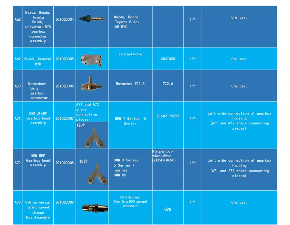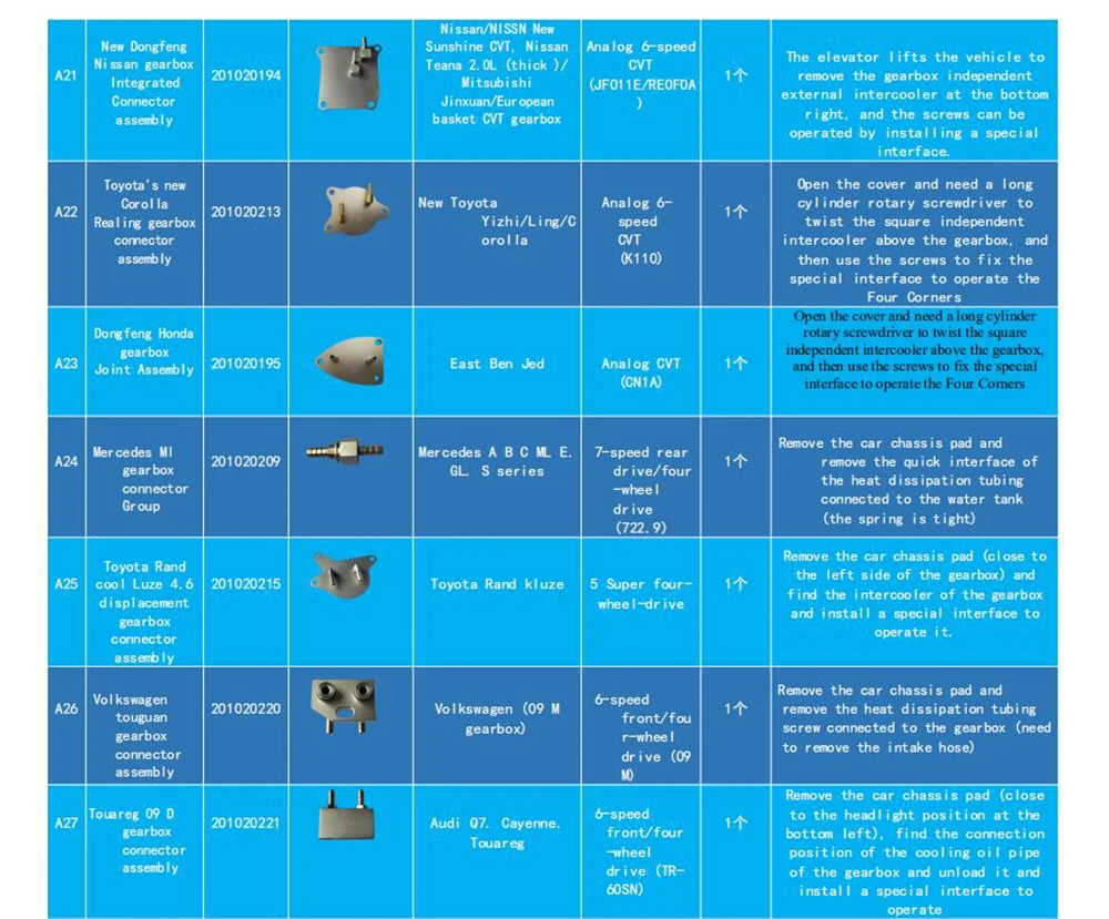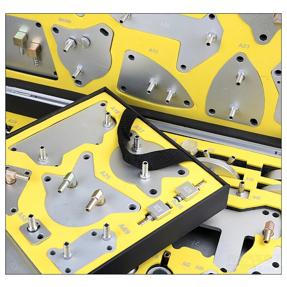 Автоматические соединения коробки передач, переключатель масла, специальные разъемыПодходит для более чем 99% представленных на рынке автомобилейВсего 116 штук для 86 типов соединителей коробки передачМатериал сплава, съемный и портативный, прочныйЦельное формование, хорошая герметичность и отсутствие протечек масла.Размер упаковки: 60x50x25 смВес: 15 кг