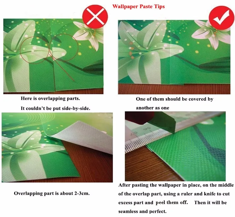 Примечание:Будут нарезаны на несколько штук для доставки. Будет иметь около 2 см перекрытия каждой стороны, прежде чем клеить на стену, пожалуйста, прочитайте инструкцию ниже.