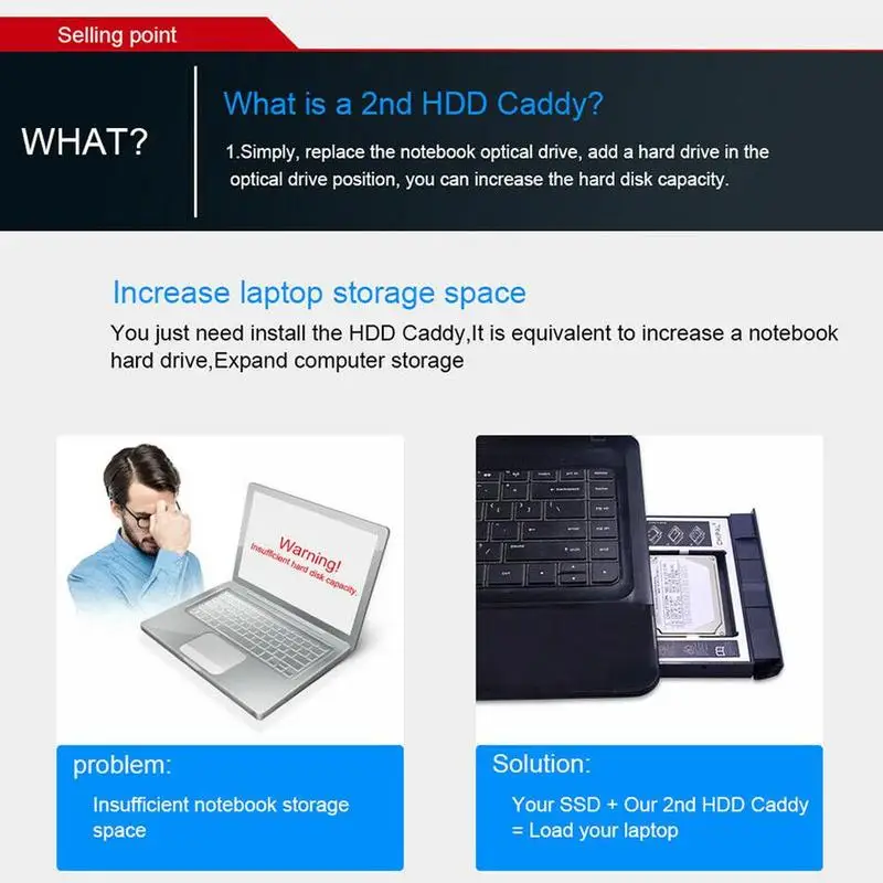 Описание товара:2-й жесткий диск Caddy/адаптер, чтобы обеспечить вам максимальную гибкость хранения данных. Со вторым жестким диском в ноутбуке вы можете ускорить резервное копирование важных приложений и важных данных. Просто извлеките диск CD-ROM и поставьте Caddy (с добавленным жестким диском) на место.Особенности:1. Это Caddy с SATA на SATA2. Для некоторых ноутбуков/ноутбуков Lenovo Thinkpad, использующих оптический привод толщиной 12,7 мм с разъемом/интерфейсом SATA.3. Также работает с жестким диском SATA/Serial ATA HHD (жесткий диск) и SSD (твердотельный накопитель) толщиной 2,5 дюйма, 9,5 мм и 12,7 мм.4. Этот адаптер подходит для 2,5-дюймового жесткого диска SATA ноутбука или SSD.5. Стандартный 13-контактный интерфейс оптического привода SATA.6. Plug & Play, полностью интегрирован в ноутбук IBM ThinkPad, не требуются кабели/блоки питания/Драйвер программного обеспечения.7. Двойная Загрузка, поддержка установки 2-й операционной системы на 2-й жесткий диск и выбора загрузки.8. Поддержка стандартов передачи SATA I / SATA II / SATA III.Совместимые модели:IBM Lenovo ThinkPad R400 R500IBM Lenovo ThinkPad T420 T420i T430 T430i T430uIBM Lenovo ThinkPad T510 T510i T520 T520i T530 T530iIBM Lenovo ThinkPad W510 W520 W530IBM Lenovo ThinkPad W700 W700ds W701 W701dsПримечание: Не совместим с ThinkPad T400 T400s T410 T410Ss T410i T420s T420si T430s T430si T500 W500 (требуется камера 9,5 мм)Комплектация:1 x 2-й жесткий диск для жесткого диска1 маленькая отвертка для установки