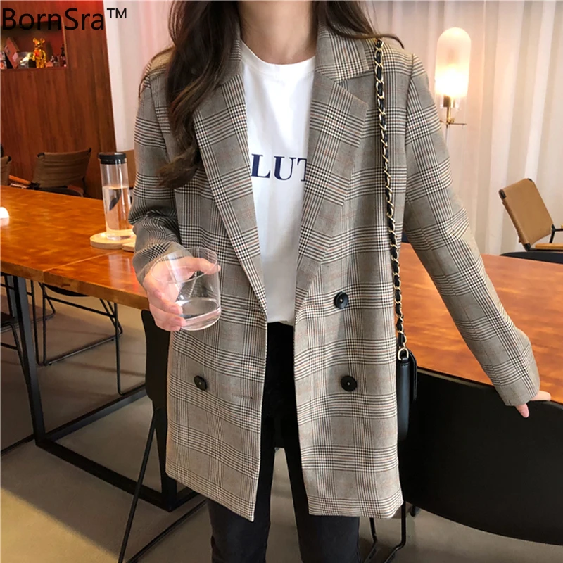 Женский офисный Блейзер BornSra, двубортный блейзер с английским воротником, с карманами, Повседневный, осенний, 2020
