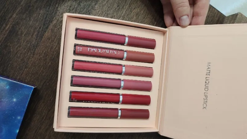 доставка 1 месяц Боже, упаковка это нечто. Все так понравилось, я в восторге. Упаковка из плотного картона, на магните. В комплект входят 6 помад разного оттенка. Есть как нюд, так и роковой красный. Помады наносятся хорошо, без полос. Фиксируются не сразу. Довольно стойкие и ноские в течении дня. Смываются мицеллярной водой. Отличные помады как для себя, так и в подарок!