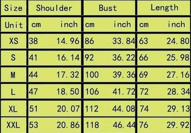 Размер плеч/см обхват груди/см длина/см Подходящая высота XS 38 44 60 160 см S 39 45 62 165 см M 40 50 64 170 см L 42 53 64,5 175 см XL 47 56 65 180 см XXL 48 59 68 185 см