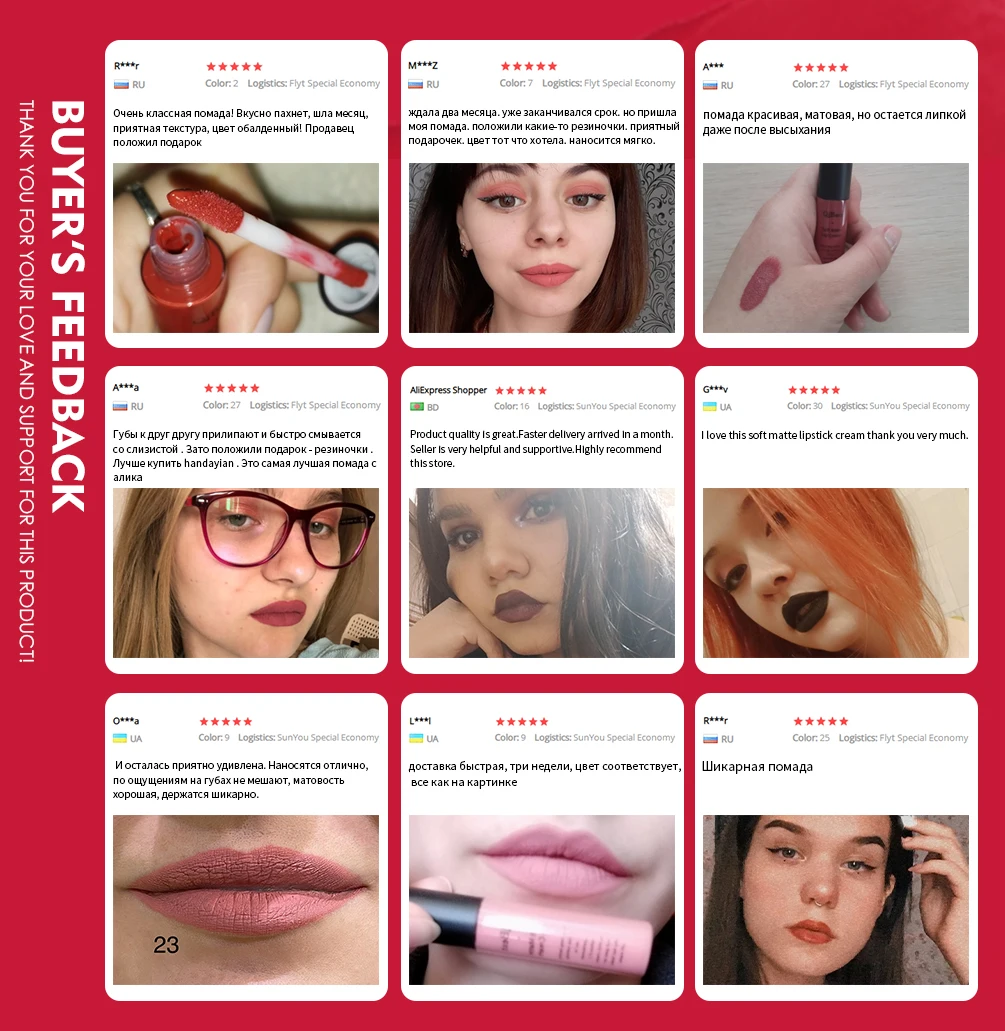 товар шёл долго, ну соответствует описанию. матовая помада держится долго,хер сотреш обычной салфеткой,мицеляка нужна. А вот остальные помады стираются с лёгкостью,ну цвета кайфовые