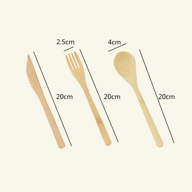 Материал: бамбук Ложка: 20*4,2 см Вилка: 20*2,6 см Ножи: 20*2 см Упаковка включает в себя: ложка, вилка, нож с сумкой