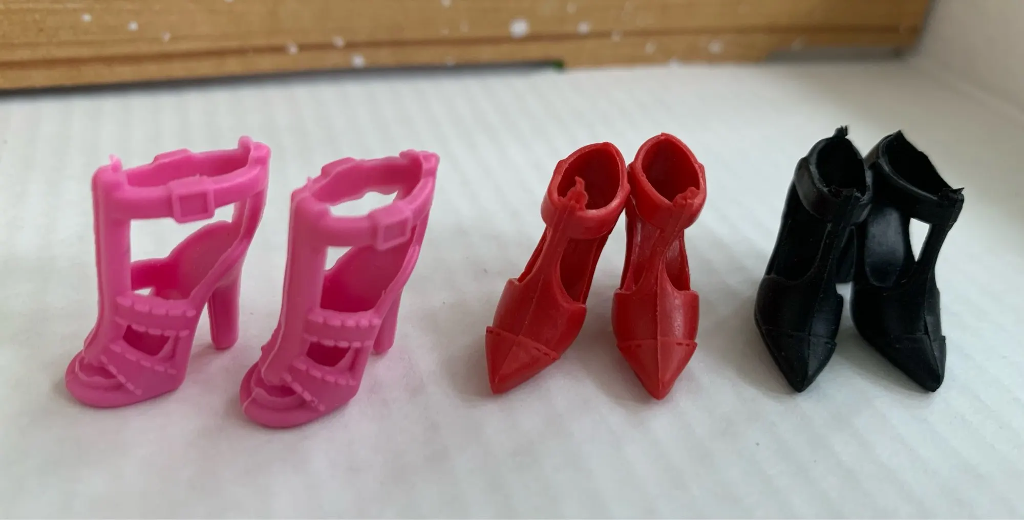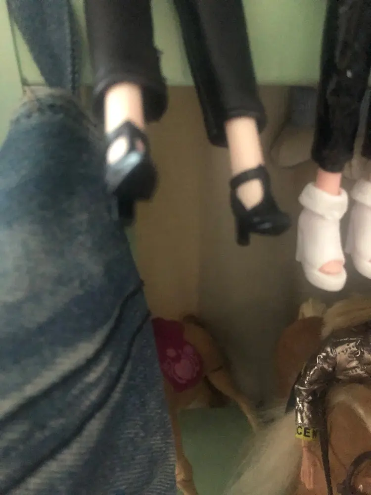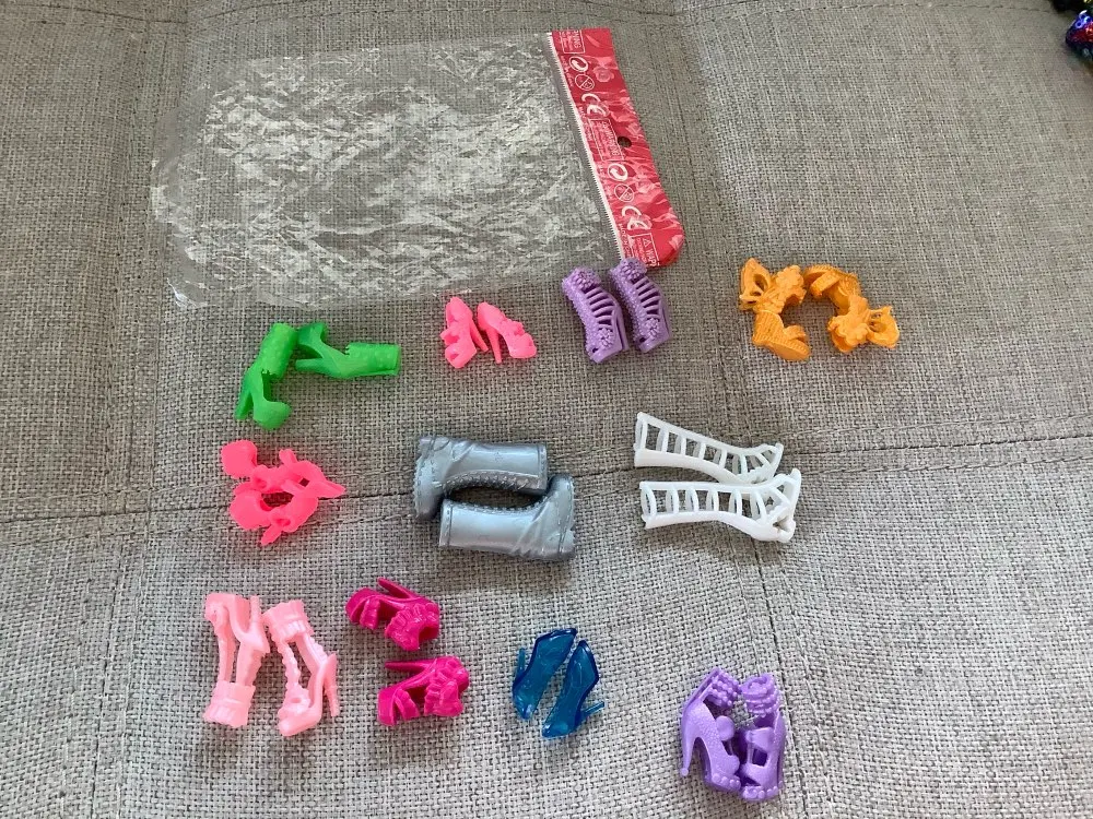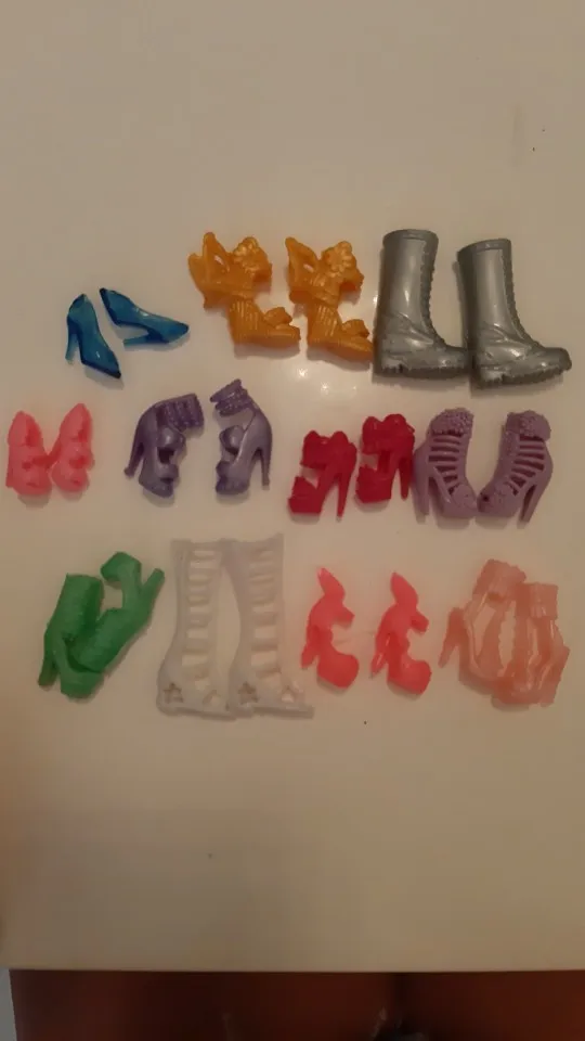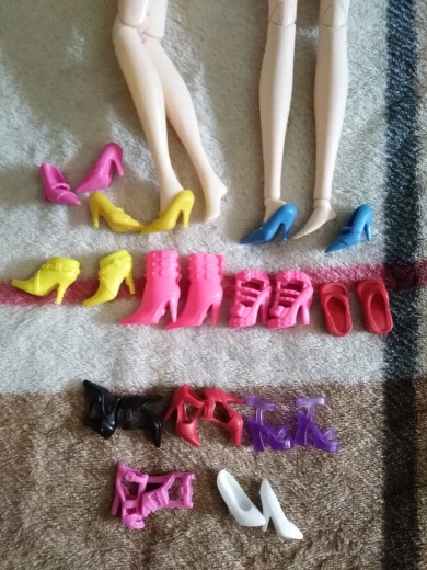 Туфельки красивые, хорошие, подходят на Барби, кроме одной пары. Сапожки шикарно смотрятся, только на одном какая-то пленка, возможно клей.
