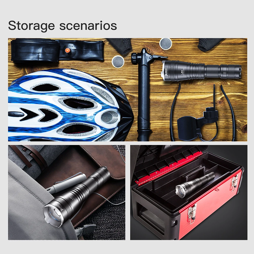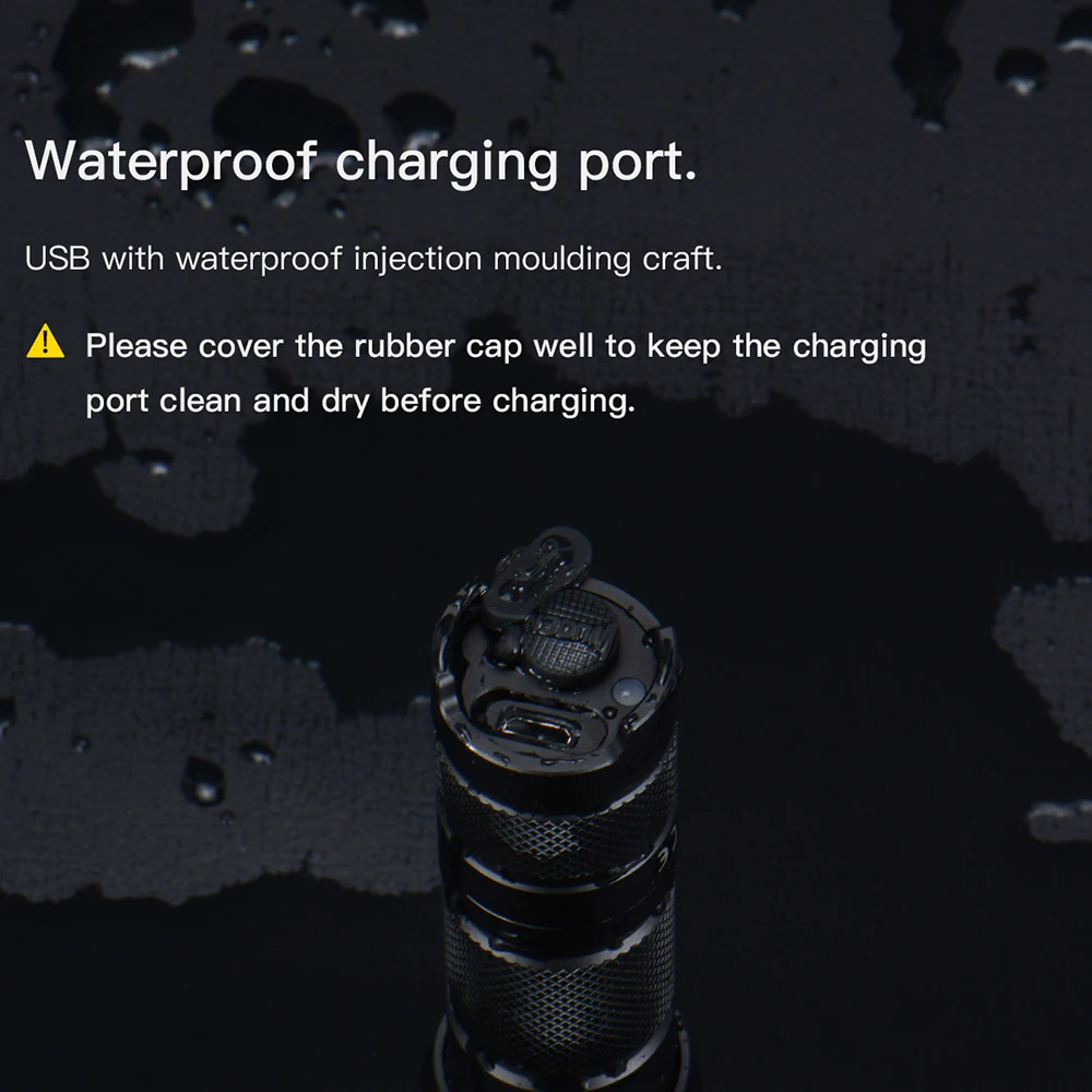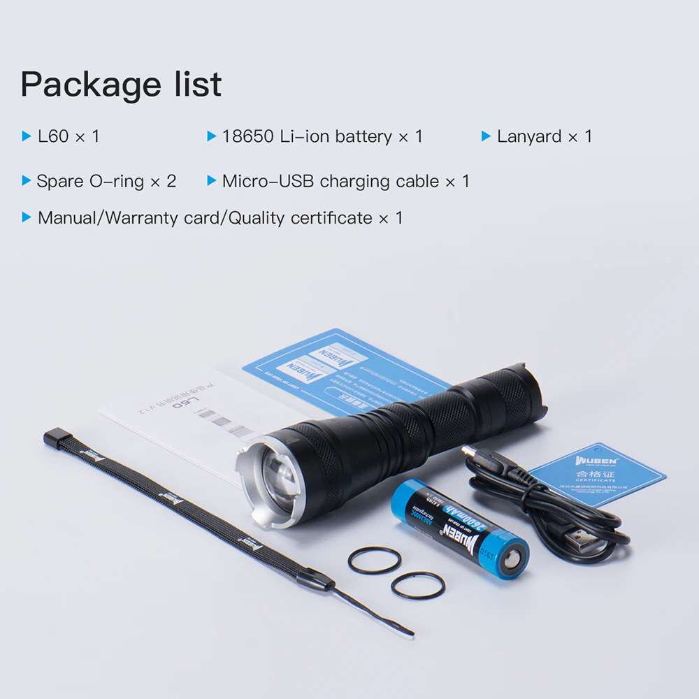 Фонарик WUBEN L60 изготовлен из твердого анодированного авиационного алюминиевого сплава 6061 и водонепроницаем и пыленепроницаем IP68, что делает фонарик очень прочным и жестким. Этот фонарик имеет умную функцию предупреждения о низком энергопотреблении, чтобы напомнить вам о необходимости его подзарядки. Когда для текущего режима заряд батареи составляет менее 30 минут, фонарик будет мигать каждые 5 минут, пока аккумулятор не разрядится. Когда фонарик заряжается, есть Светодиодный индикатор для состояния зарядки.