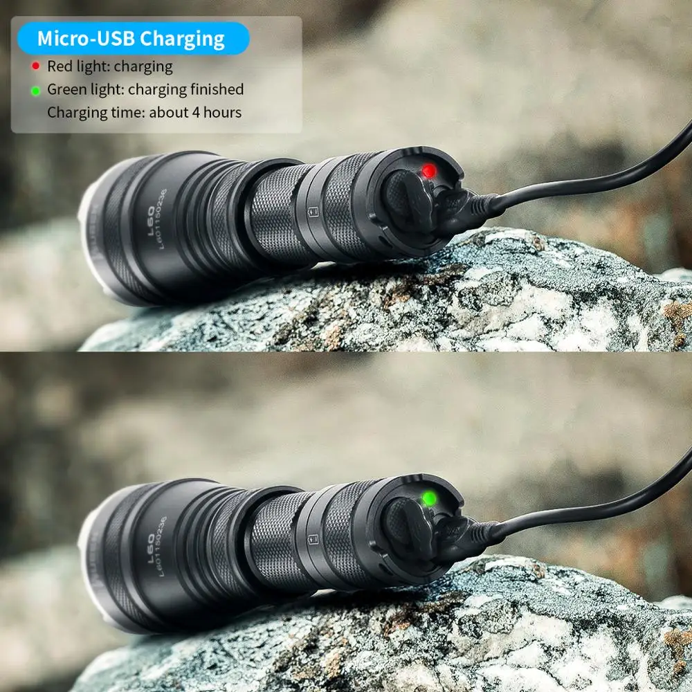 Этот светодиодный фонарик питается от перезаряжаемого литий-ионного аккумулятора 2600 мАч (входит в комплект), что является экономичным и экологичным. Он также совместим с 2 батареями CR123A (не входят в комплект), хороший выбор в качестве резервных батарей для активного отдыха. Поставляется с кабелем Micro-USB, который может заряжать фонарик напрямую. После полной зарядки фонарик может работать около 1,8 часов в высоком режиме (1200 люмен) и до 219 часов в эко-режиме.