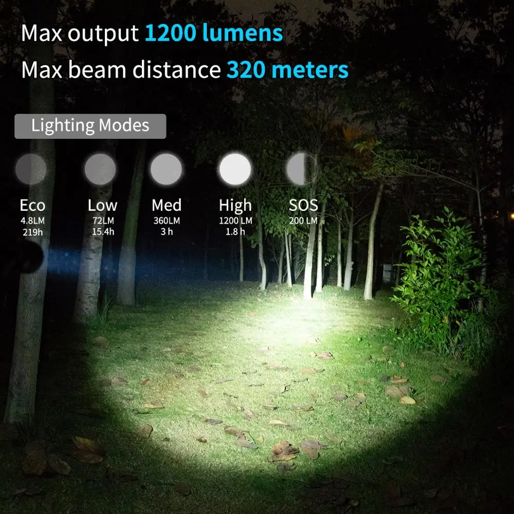 WUBEN L60 имеет 4 основных режима: высокий/1200LM, средний/400LM, низкий/75LM, Eco/5LM; И 1 режим для аварийной ситуации: SOS/200LM. Для 4 основных режимов есть функция памяти. Каждый раз он будет включен в режим, который он выключен в прошлый раз.