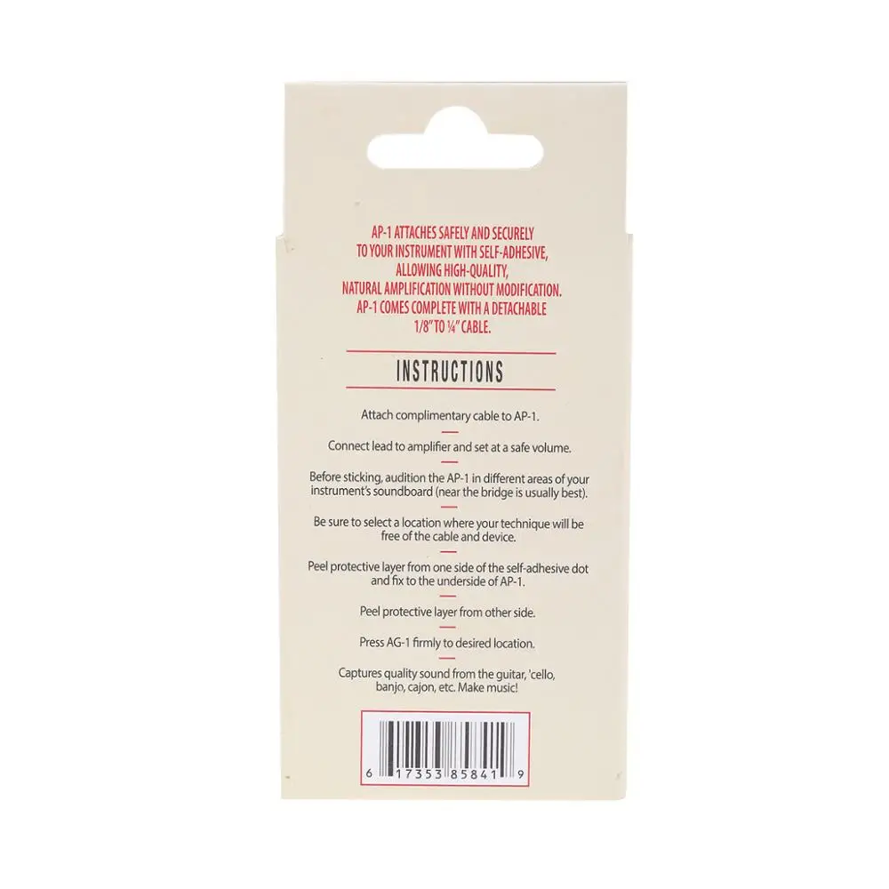 AP-1 надежно крепится к поверхности всего, что вибрирует, воспроизводит естественный акустический звук через пассивную пьезосистему. Подходит для акустической/классической гитары, укулеле и т. д.