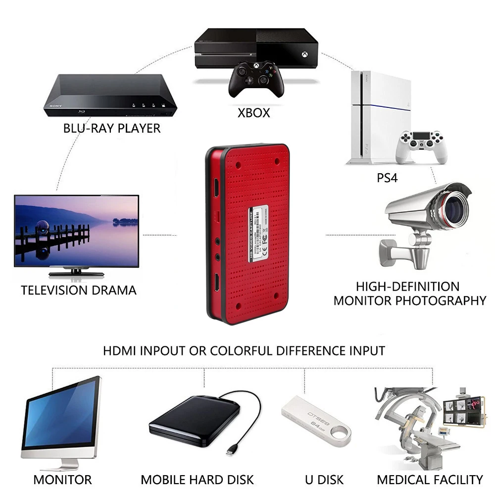 С помощью этого видеозахвата 284 HD вы можете снимать видео до 1080P с HD, Ypbpr (компонентный) или композитного порта, такого как blue ray, телеприставка, компьютер, игровая коробка, VHS и т. д. С пультом дистанционного управления, можно установить входной сигнал вручную, качество записи, Или снимайте неподвижное изображение с помощью кнопки моментального снимка.