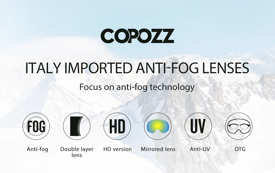 Из-за сильного солнесветильник, отраженсветильник Снежной Горы и холодного ветра, стимулирующего глаза, мы предлагаем вам выбрать профессиональные защитные лыжные очки, а бренд «COPOZZ»-Ваш лучший выбор. Лыжные очки COPOZZ больше подходят для лица и защищают глаза от сильного ветра. Линзы изготовлены из импортного материала, а зеркальное покрытие закалено, устойчиво к царапинам и истиранию. Очки на 100% защищены от УФ-лучей, играют ключевую роль в защите глаз