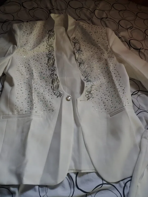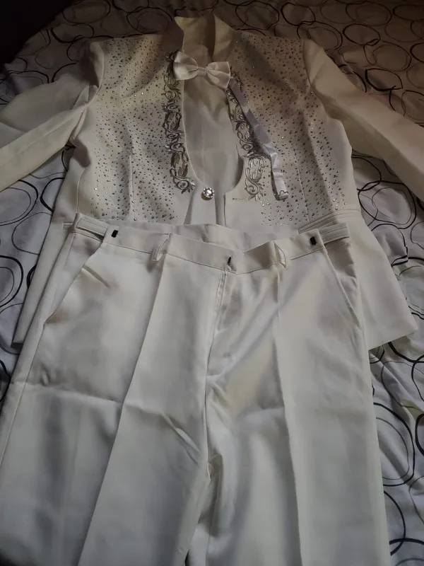 Продавец был очень полезен при выборе размера. Пожалуйста, проверьте размер и проверьте с продавцом перед покупкой. Я купил Азиатский размер больше для мужчин 5'8 ". Штаны поставляются непродуваемыми и измеряются в 43,5 дюйма в длину (длина), а материал очень тонкий и легкий (см. Фото... извините, плохое освещение). Цвет не белый. Цвет более белый или кремовый. Красивый костюм. Я буду заказывать снова. Быстрая доставка в США