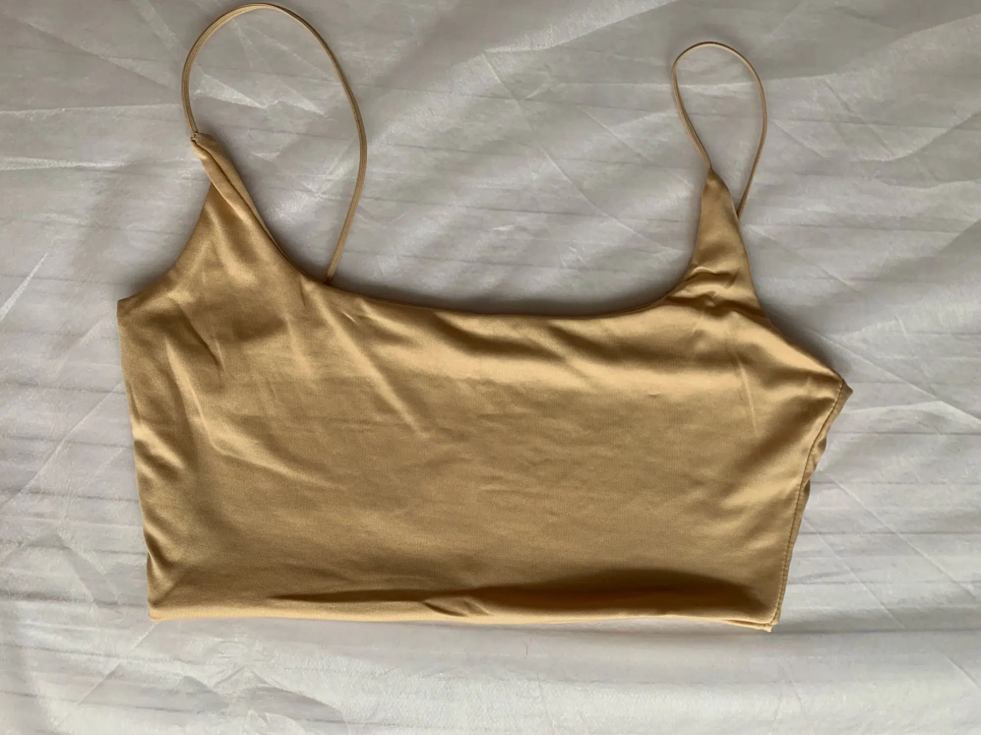 Заказывал в бежевом цвете. Пришёл золотистого. Грудная клетка 87, заказывала размер S. Не прилегает к телу. Чуть большеват.