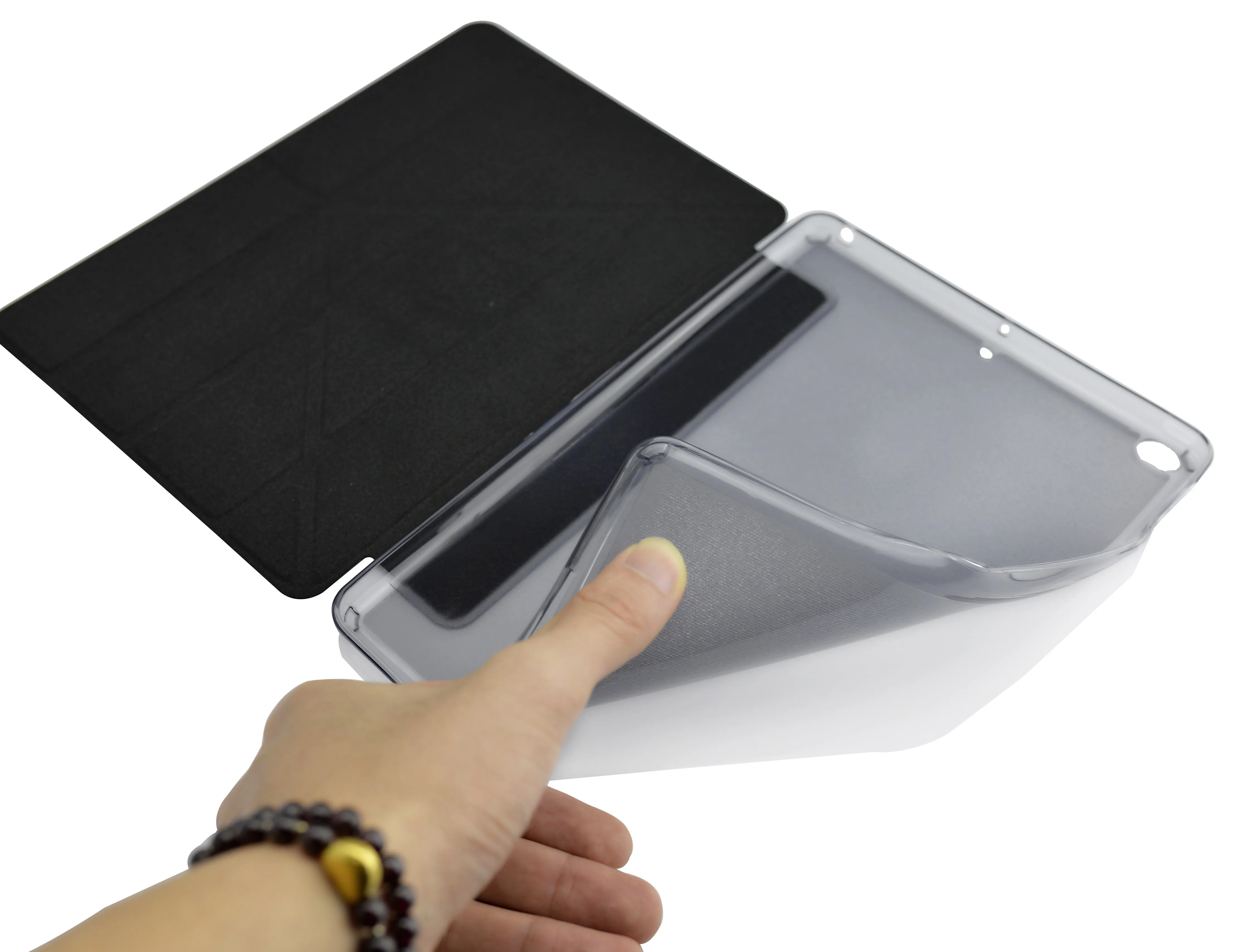 Передняя складная умная крышка изготовлена из полиуретана и мягкого на ощупь прорезиненного покрытия внутри и снаружи задней крышки, которое приятно лежит в руках и делает его менее скользким. Это цельный чехол, передняя и задняя части не отделяются