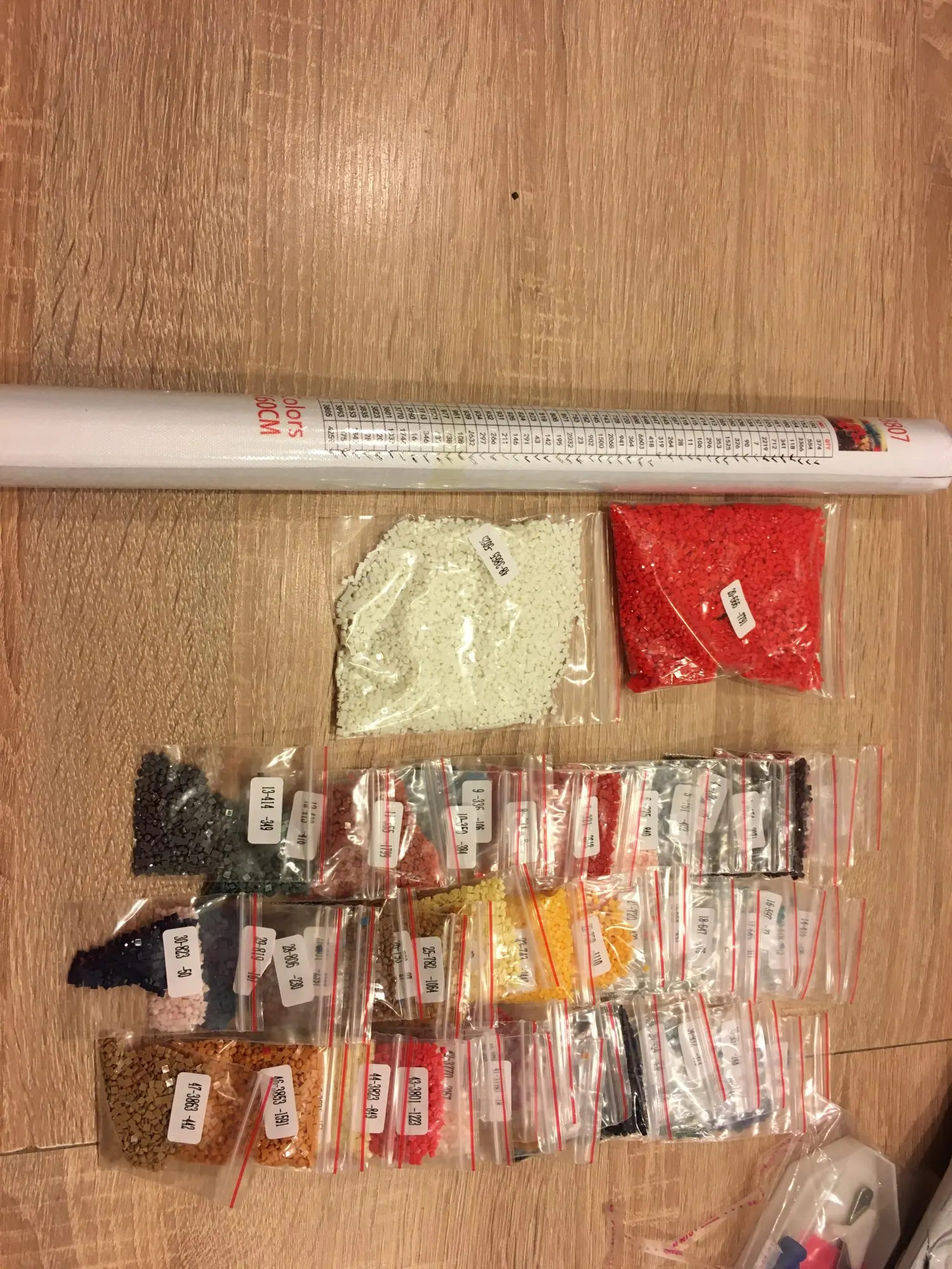 Товар был хорошо упакован в пузырчатую пленку, время доставки в Польшу было довольно быстрое, я также получил сообщение, когда посылка была в моей стране. Алмазы были упакованы в отдельный пакет, и каждый цвет был в отдельном мешке, и количество алмазов было точным, как указано в списке. Продавец также включал инструменты, поэтому все выглядит идеально, я добавлю дополнительный отзыв с фото готовой картины, когда я закончу.