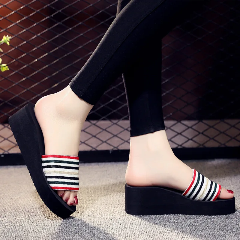 Женские шлепанцы, пляжные сандалии в богемном стиле, шлепанцы в синюю полоску, на платформе, высокий каблук, летние Тапочки