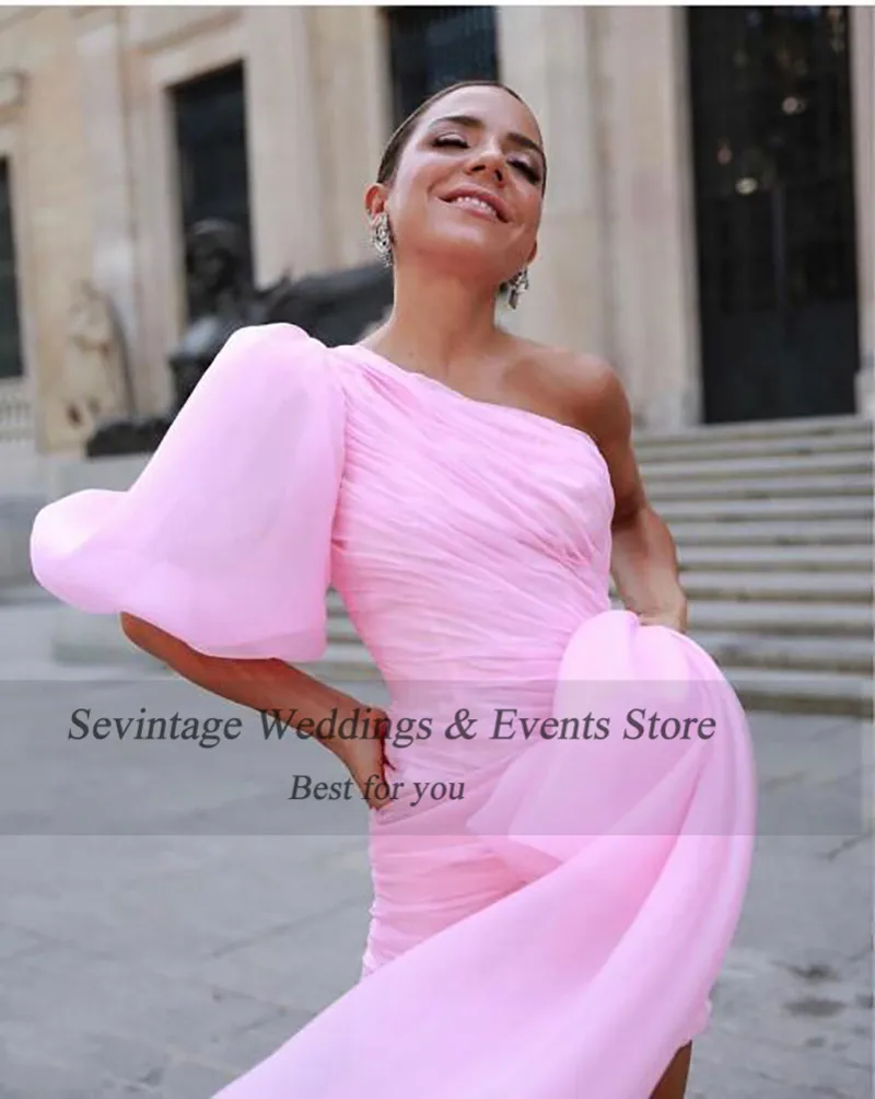 Розовое платье-футляр из органзы Sevintage, раньше колена, на одно плечо, плиссированное коктейльное платье, платья для выпускного вечера, 2020