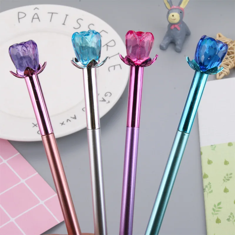 24 шт. металлическая гелевая ручка с кристаллами и розами, металлическая цветная ручка, маленький цветочный колпачок, черная ручка на водной основе, милые школьные принадлежности, канцелярские принадлежности