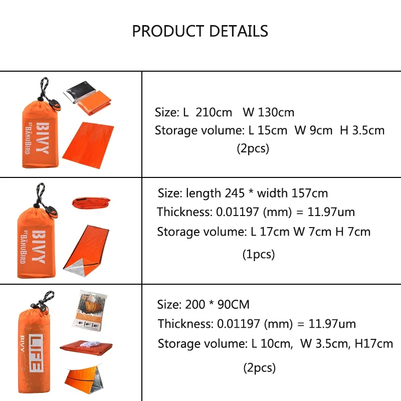 Материал: полиэтиленовая пленка Размер продукта: O/Размер: 130*210 см/Объем хранения: длина 9 см Ширина 3,5 см высота 15 см (2 шт.) М/Толщина: 0,01197 (мм) = 245 мкм. характеристики: 157 * см Объем хранения: диаметр круглого дна 7 см Высота 17 см (одна упаковка) М2/характеристики: 200*90 см/толщина: 0,01197 (мм) = 3,5 мкм/Объем хранения: длина 10 см, ширина см, Высота 17 см (упаковка из 2 шт.) Характеристики: 1. Используйте при низких температурах, может сохранять тепло, не так просто излучать 2. Можно использовать как матрас для пикника 3. Цвет первой помощи оранжевый, что облегчает поиск спасателей. Это один из выживания в дикой природе. Добавление слоя аварийного одеяла в спальный мешок может улучшить изоляцию, что хорошо для обеспечения температуры сна. 4. Аварийный холодостойкий спальный мешок, который можно использовать как спальный мешок в покое для изоляции внешнего кондиционера и достижения эффекта согрева 5. Спальный мешок размером с ладонь, дизайн спального мешка, ультратонкий, легко собирать, легко носить с собой 6. В наружной среде, подходит для исследований на открытом воздухе, исследований, туризма и стихийных бедствий. Легко носить с собой, маленький, красивый и практичный.