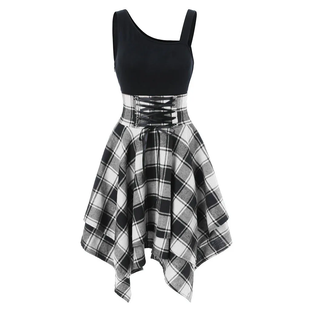 Модное женское асимметричное платье без рукавов с открытыми плечами и перекрестной шнуровкой в клетку