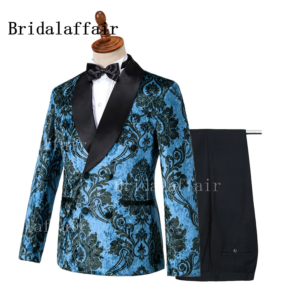Свадебный костюм Bridalaffair, облегающий костюм из двух предметов, синий вельветовый костюм с цветочным принтом, двубортный смокинг для жениха