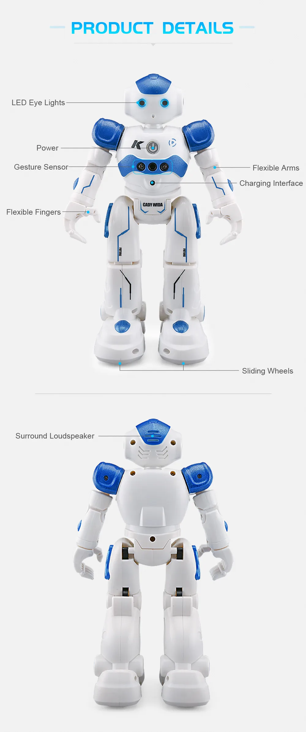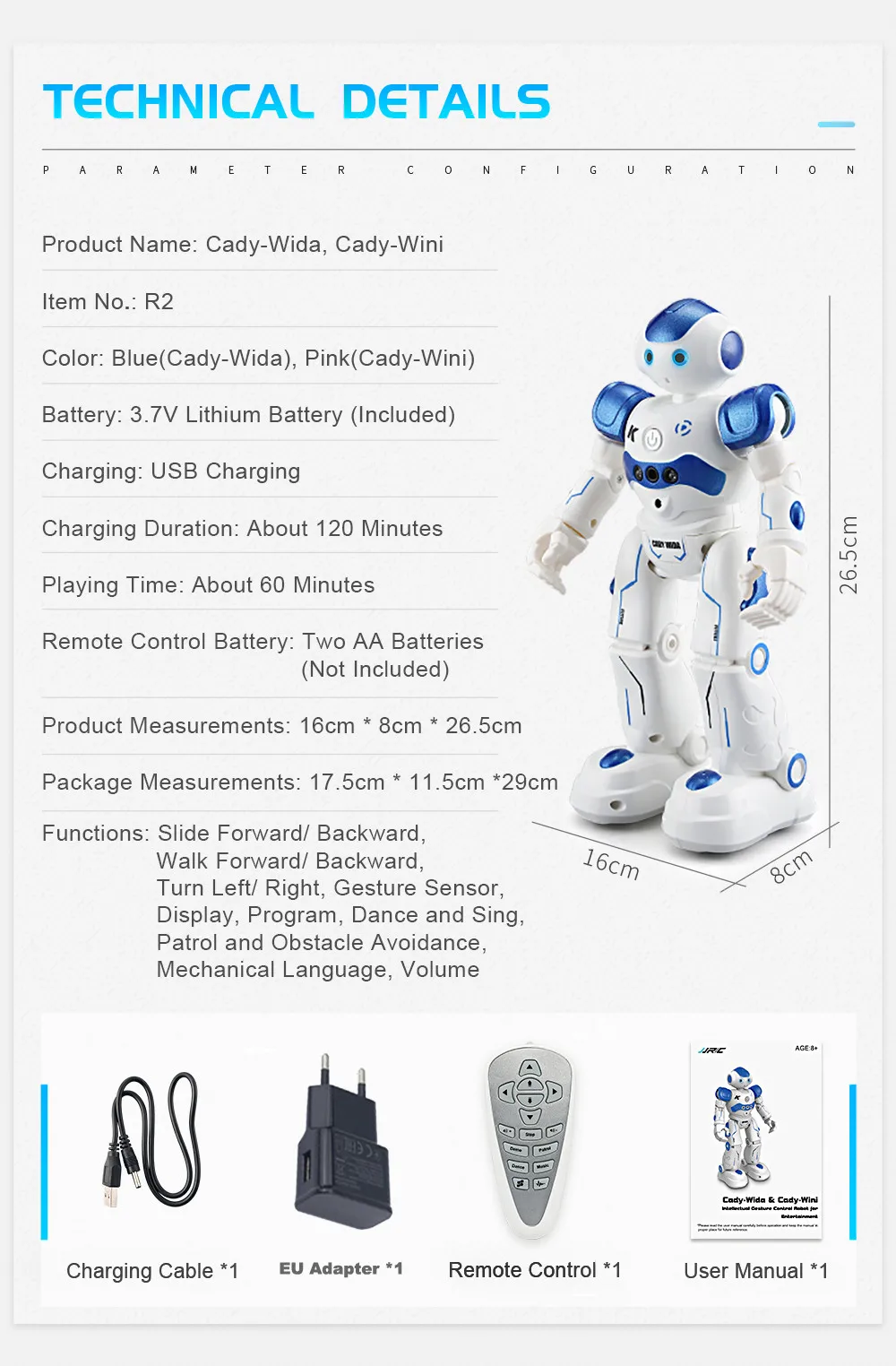 Описание:JJRC R2 CADY WIDA / WINI-это Интеллектуальный робот RC, который способен создавать много веселья для ваших маленьких детей. Когда ваша рука движется, датчик жестов обнаружит такое движение и сделает робота продвинутым, отступлением, поворотом влево/вправо. Интересно, что, поскольку он патрулирует вперед и встречает препятствия на своем пути, он будет двигаться назад, а затем поворачиваться влево/вправо. Чтобы создать больше удовольствия, вы можете программировать серию движений и видеть, как робот выполняет их ритмично с динамической музыкой. Основные характеристики:● Управление жестами включено датчиком спереди, который обнаруживает жесты вашей руки● Избегание препятствий будет активировано, когда оно будет патрулировать вперед и сталкиваться с любыми препятствиями● Программирование движения + автоматический дисплей: Настройте то, что вы хотите, чтобы робот сделал свободно● Пение и танцы с громкоговорителем, а также гибкие руки и ноги Характеристики:Встроенный аккумулятор: 3,7 в 600 мА/ч, литий-ионныйДетальное Расстояние управления: около 10 м
