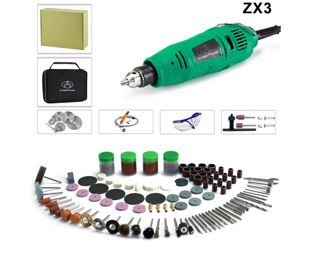Электрическая дрель с вращающимся инструментом * 1 шт.Очки * 1 шт.Игла для карвинга * 30 штКлюч патрона * 2 шт.Пильный диск * 6 шт.Гибкий вал * 1 шт.Роторный инструмент, аксессуары для электродрели * 160 шт.Тканый мешок * 1 шт.Картонная упаковка * 1 шт.