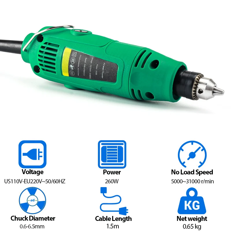 1: Напряжение: 220 В, 50/60 Гц2: Мощность: 260 Вт3: скорость: 5000-31000/мин4: диаметр патрона: 0,6-6,5 мм5: регулятор с пятью стойками6: Изумрудный Кристалл нефритовый Агат может металлическое дерево и другие материалы, печатная плата7: резьба, сверление, резка, полировка8: не стоит недооценивать возможности этих мини-шлифовальных машин!9: вес: 0,65 кг10: Применение: ювелирные изделия, дом и Деревообработка11: Функция: для дерева, металла, керамики, пластика, сверления, полировки, шлифовки, формирования резьбы и шлифовки.Совет: некоторые страны не могут отправлять (вставлять) товары. Мы выберем их. Пожалуйста, посмотрите на картинку2: очки предоставляются покупателям в качестве подарка, цвета отправляются наугад. Пожалуйста, знайте