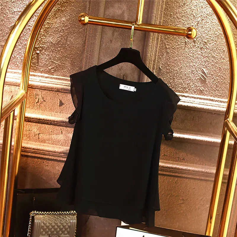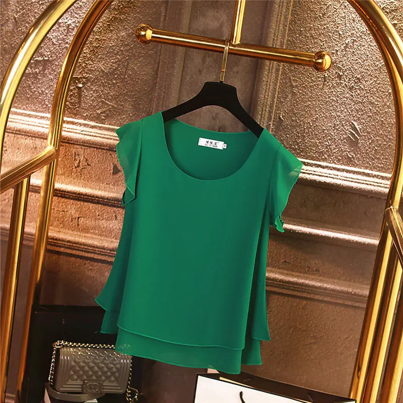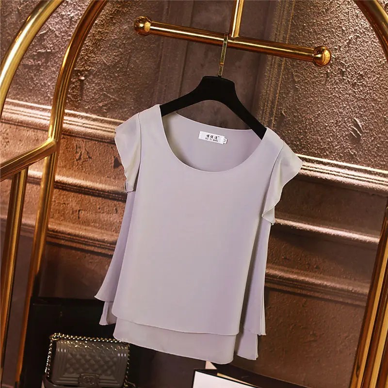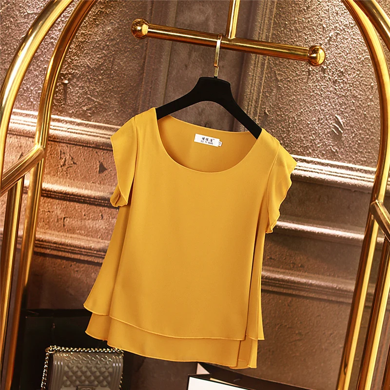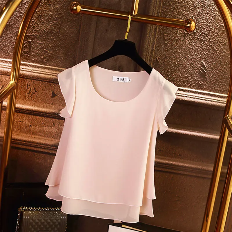Женская шифоновая блузка, с коротким рукавом, круглым вырезом и оборками, для весны и лета, DD8427