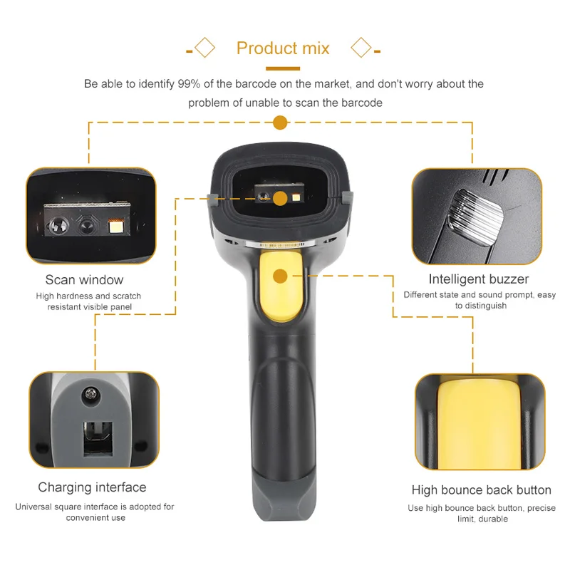 --- 1.【Magic Diamond система прицеливания и вибрационное оповещение 】 скорость чтения молнии в сочетании с большой глубиной поля не означает больше разочарования задержек, пытающихся получить ваш сканер под прямым углом или на расстоянии. В дополнение к зуммеру и светодиодный светильник, когда сканирование успешно, вы получаете тактильный сигнал в виде легкой вибрации. Зуммер может быть установлен для отключения звука, чтобы обеспечить спокойную работу. --- 2.【Versatile 3-в-1 Transmission】The штрих-код может работать через 2,4 ГГц беспроводной + USB 2,0 проводной. Он также совместим с Bluetooth. Поддерживает Windows и Mac OS; Работает с QuickBooks, Word, Excel, Novell; И почти всеми распространенными программными средствами. Его можно широко использовать в супермаркетах, торговых центрах, косметических магазинах, розничной промышленности, почтовой промышленности, логистике, банках и медицинских институтах. --- 3. 【Большой аккумулятор 2000 мАч, 60 дней в режиме ожидания 】большой встроенный аккумулятор 2000 мАч, время работы в режиме ожидания может превышать 60 дней. Непрерывное сканирование время может быть до 16,5-19,5 часов при полном заряде. Не беспокойтесь после одной зарядки. --- 4. 【Ударопрочный силиконовый дизайн 】яркий оранжевый силиконовый защитный чехол может избежать царапин и трения при падении с вашего стола или полки. Использование ярко-оранжевого цвета также увеличит визуальное изображение сканера штрих-кодов, когда вы не используете или не оставляете его в любом месте. --- 5. 【Поддерживаемые цифровые и печатные 1D 2D кодовые обозначения: 1D: кодабар, код 11, коде93, MSI, код 128, UCC/EAN-128, код 39, EAN-8, EAN-13, UPC-A, ISBN, Industrial 25, interleaved 25, Standard25, Matrix 2D: QR, DataMatrix, PDF417, Aztec, Hanxin, Micro PDF417. Он может считывать штрих-код, отображаемый на мониторе компьютера.