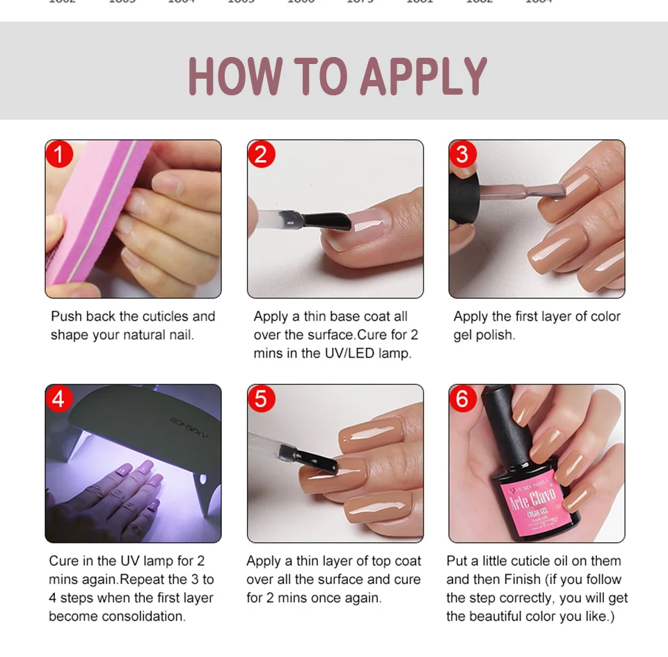 1.--Очистите ногти, затем обрежьте поверхность ногтей как обычный процесс маникюра.2.--Полностью встряхните лак, он может сделать польский цвет сбалансированным. [Важно]3.--Сначала нанесите базовый гель, который может сделать лак длительным, вылечите УФ-лампой или светодиодной лампой. [Необходимо]4.--Нанесите лак напрямую, вылечите УФ-лампой в течение 2-3 минут или вылечите светодиодной лампой в течение 60 секунд; при сушке нанесите второй слой и снова закрепите УФ-лампой или светодиодной лампой.5.--Пальто со съемным верхним покрытием, которое может сделать цвет более блестящим, излечивается УФ-лампой или светодиодной лампой.