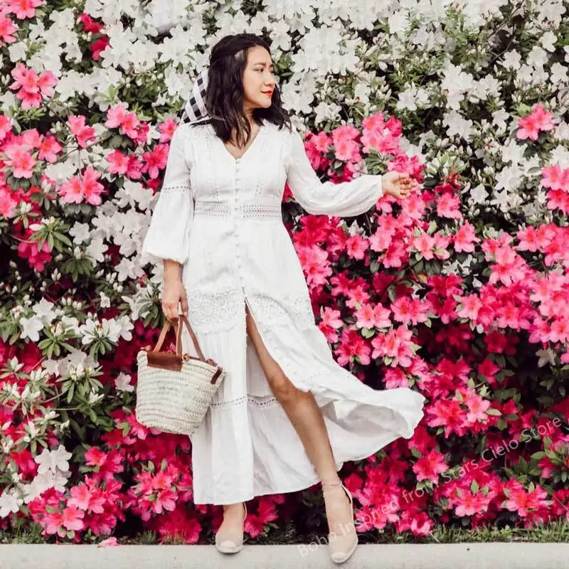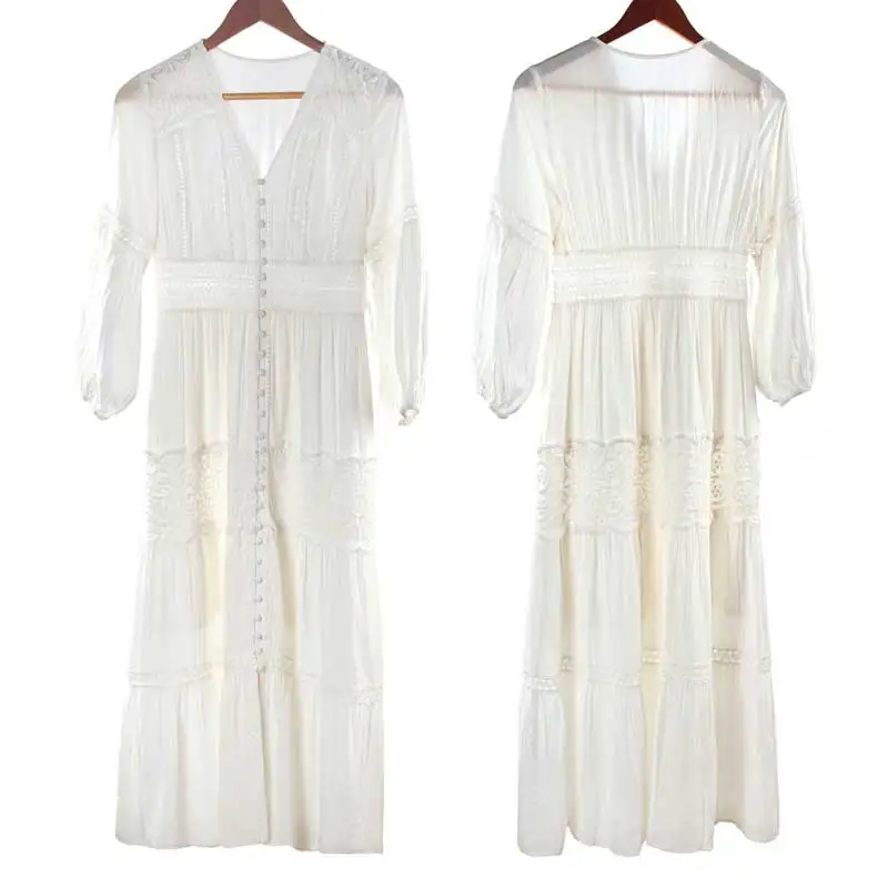 Женское Хлопковое платье макси, белое элегантное платье на пуговицах с V-образным вырезом и длинным рукавом, весна-осень, богемный Вдохновленный