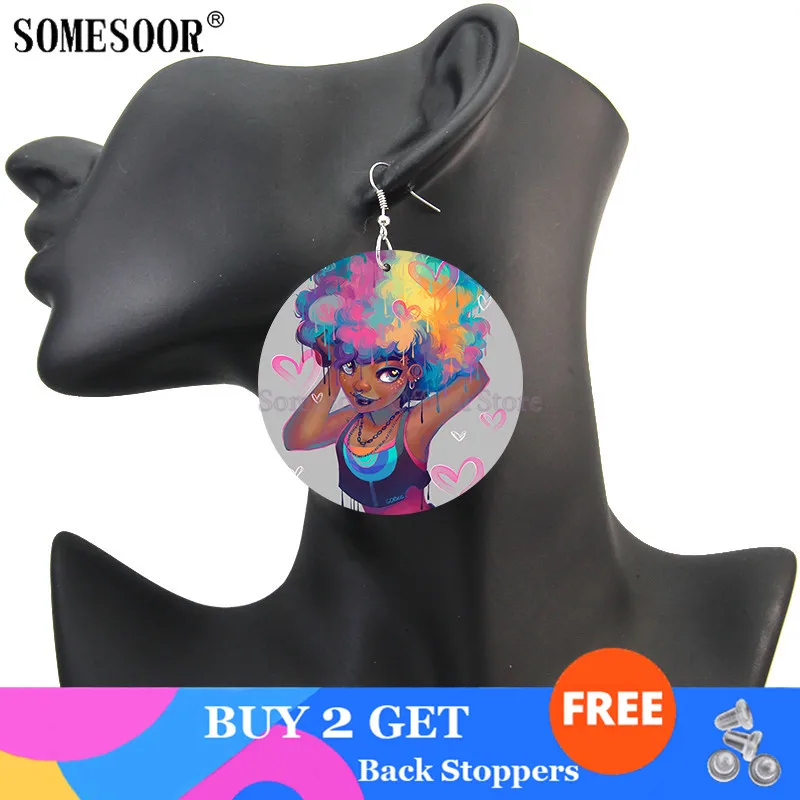 SOMESOOR Симпатичные поппин девушки афро вьющиеся волосы натуральные деревянные висячие серьги с обеих сторон деревянные висячие ювелирные изделия для женщин Подарки