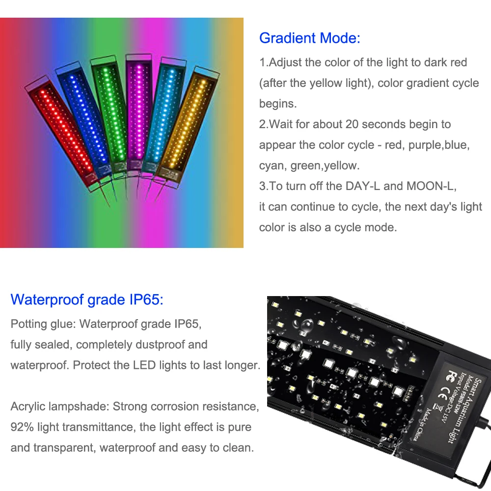 * Высокотехнологичный ЖК-цифровой контроллер дисплея, легко устанавливается и проверяется цвет и яркость аквариума рыбный светильник. IP65 Водонепроницаемый и легко моется и протирается, нет ничего страшного, когда огни аквариума выпадают в воду в течение короткого времени.