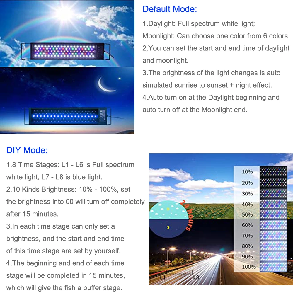 Этот новый аквариумный светильник разработан с собран в таймер, программируемый сумерки, 2 канала Дневной светильник и луна светильник самостоятельно.