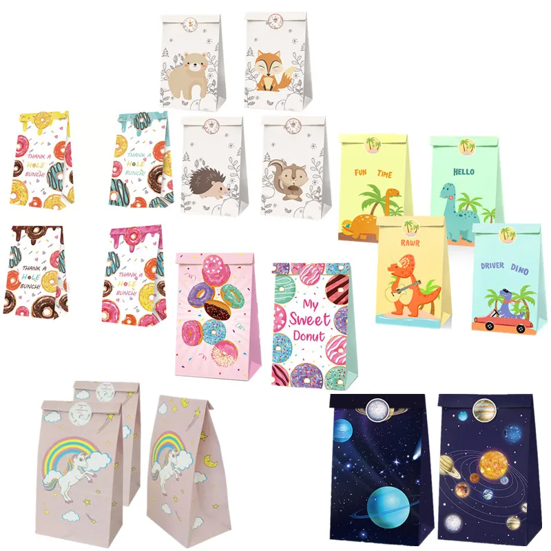 12 шт смешанных типов динозавров/пончиков/космоса/джунглей/единорогов животных конфеты подарочные сумки с наклейкой упаковочные коробки для гостей подарок на день рождения