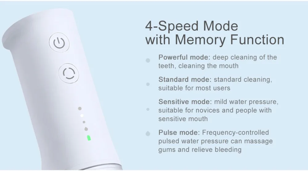 Ирригатор полости рта работает очень хорошо и очень просто и модно. Качество изготовления также очень хорошее. Скорость может быть плавной во время процесса одним нажатием кнопки. Так как у меня нет нити, можно использовать, потому что десны болят, работает во рту душ для этого идеального. Это не моя первая, но я думаю, что до сих пор лучшее! Спасибо продавцу.