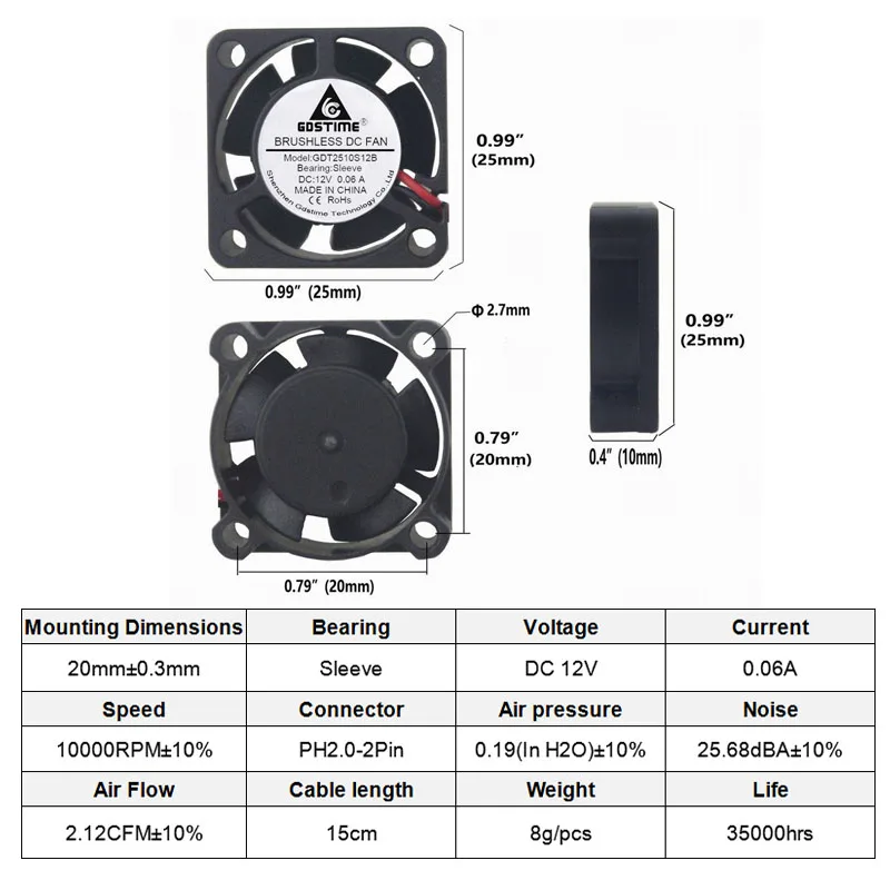 Gdstime DC 12V Small Cooling Cooler Brushless Fan 25X10mm