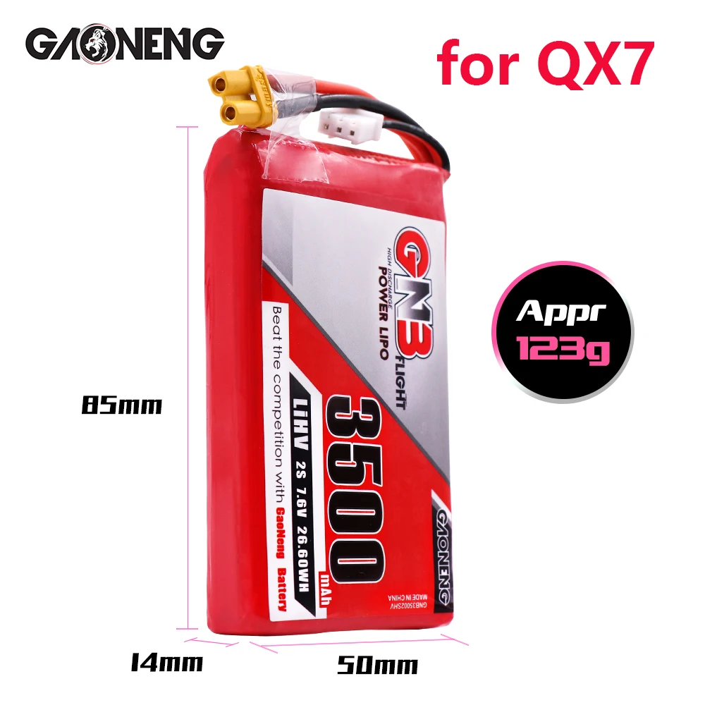 Спецификация:Емкость: 3500 мАчНапряжение: 2S1P / 2 ячейки/7,6 В HVРазряд: 2C Постоянный/4C BurstВес: 123 г (включая провод, штекер и чехол)Размеры: 14x50x85 ммРазрядная вилка: штепсельная вилка XT30Посылка включает в себя:1 * Gaoneng 7,4 V 2S 3500mAh 2C батарея дистанционного управления (специально для QX7)