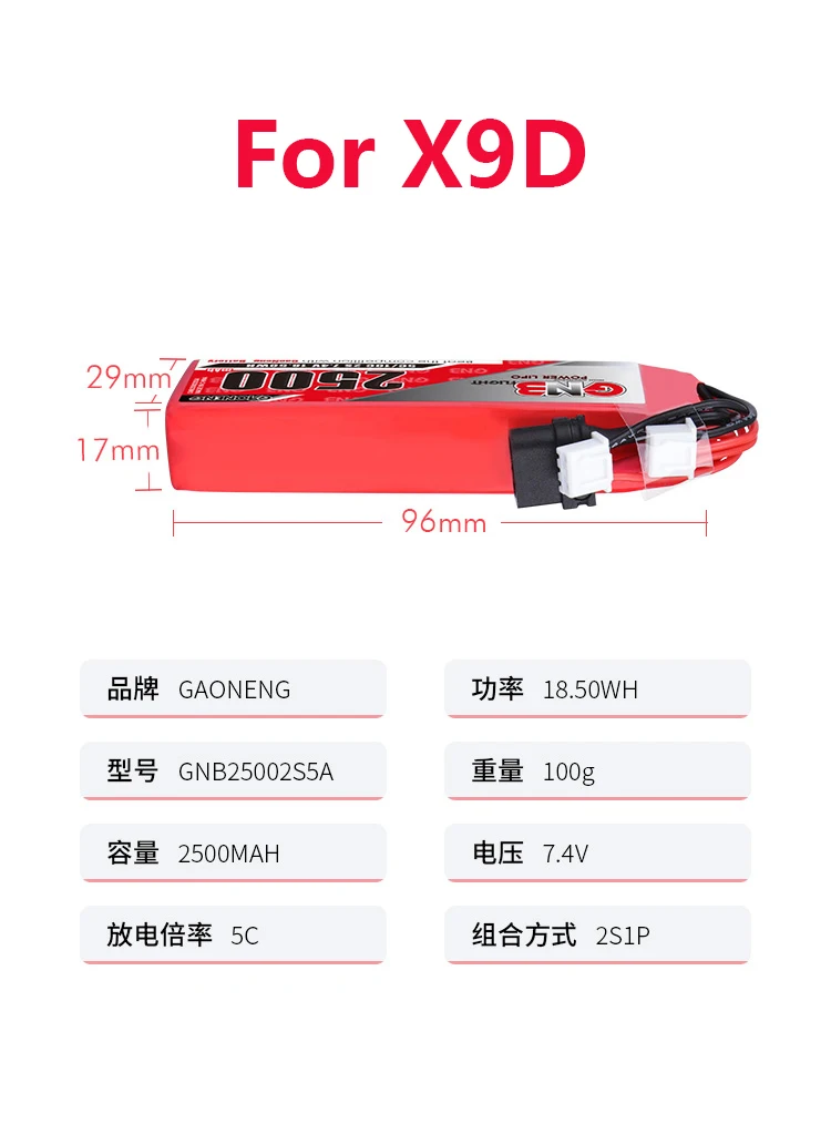 Спецификация:Емкость: 2500 мАчНапряжение: 2S1P/7,4 VРазрядка: 5С Постоянный/10C BurstВес: 100 г (включая провод, штекер и чехол)Размеры: 96x17x29 ммПодходит для дистанционного управления: X9D PlusПосылка включает в себя:1 * пульт дистанционного управления Gaoneng 7,4 V 2500mAh 5C