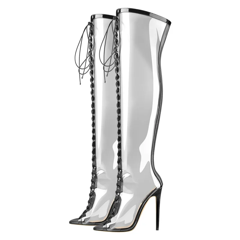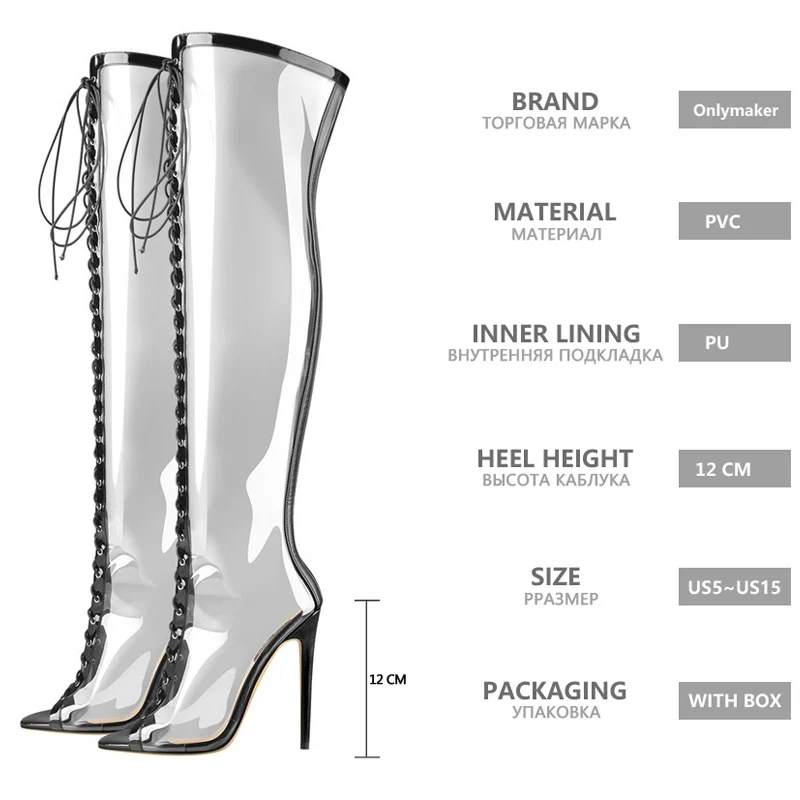 Onlymaker Женские туфли с открытым носком, на шпильках 12 см, на высоком каблуке, прозрачные, из ПВХ, вечерние, выше колена, на шнуровке
