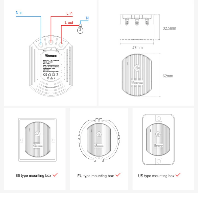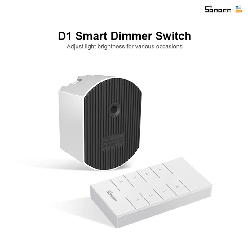 Из-за популярного спроса SONOFF в итоге выпускает новый умный диммер D1. Он превосходно улучшает систему освещения в вашем доме с различными уровнями яркости. Включает/выключает кожу влагой и приглушенным светом накаливания Светильник лампы и затемнения светодиодный светильник s через RM433 пульта дистанционного управления, приложение eWeLink, Alexa или Google Home. Новый режим восхода и захода солнца доступен в смарт-сцене, чтобы активировать ваш светильник, когда закаты и активировать его при восходе солнца. Удивительно, что график синхронизации и настройка яркости могут быть включены одновременно в смарт-сцене. Это означает, что вы можете запланировать светильник для спальни, чтобы автоматически включить на 40% яркости при 7:00 утра и выключить на 100% яркости при 7:00 вечера. Есть основа для пульта дистанционного управления RM433, который используется для прямой замены переключателя на светильник и установки в 86 монтажную коробку, все выглядит идеально. Кроме того, Диммер может быть установлен в монтажную коробку европейского и американского типа.