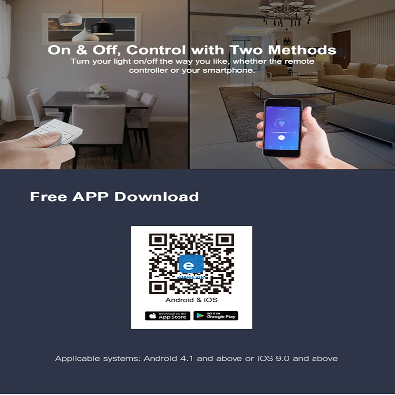 Включайте И Выключайте, Управляйте двумя способами: Включите и выключите светильник, как вам нравится, независимо от того, удалите ли устройство управления или ваш смартфон. Настройте вечерние настроения с помощью своего голоса: работает с Google Assistant и Alexa. Таким образом, вы можете повернуть вверх/вниз светильник уровня яркости с вашей голосовой командой для отличной атмосферы. Настройте 4-уровневое изменение яркости по вашему настроению: Регулируемый на 4 уровня светильник на пульте дистанционного управления RM433, настраиваемый на самый высокий и самый низкий уровень яркости в приложении eWeLink. Непрерывный режим восхода и захода солнца: следите за восходом солнца и устанавливайте время своего местоположения, чтобы вы могли создать сцену, которая активируется в фиксированное время, когда солнце поднимается или когда солнце садится. Переключение с более легким затемнением под рукой: Выключите светильник случайно с помощью включенного пульта дистанционного управления на захватывающий светильник движения, наслаждайтесь моментом погружения. Применимый светильник s: приглушенный светильник накаливания и светодиодный светильник с регулируемой яркостью s. Совместимо с базой для идеального сочетания: дополнительный пульт дистанционного управления может быть непосредственно установлен на 86 Тип монтажной коробки.