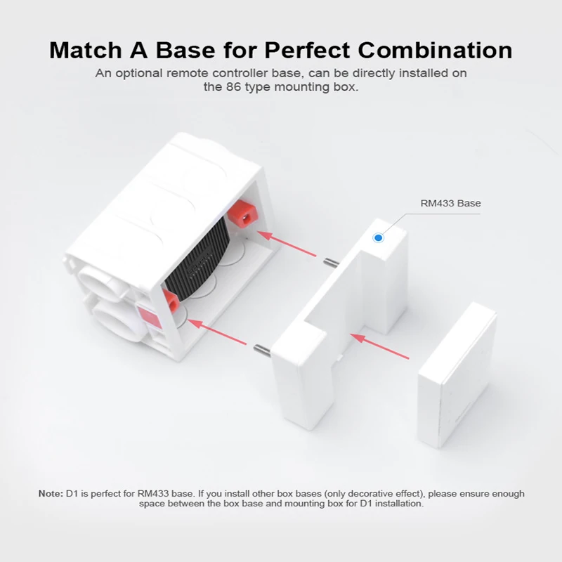 D1 идеально подходит для базы RM433. Если вы устанавливаете другие коробки (только декоративный эффект), пожалуйста, убедитесь, что между основанием коробки и монтажной коробкой достаточно места для установки D1.