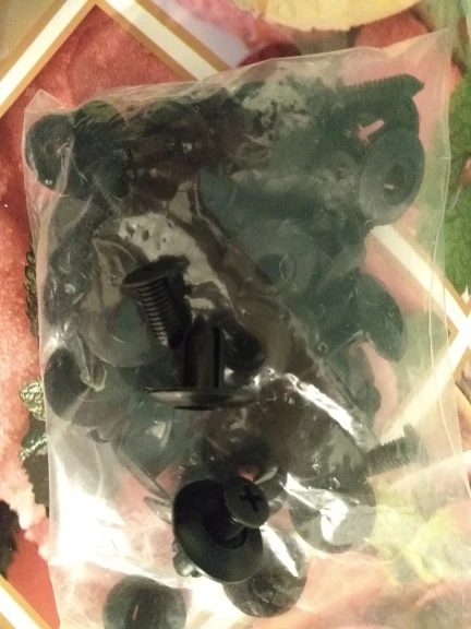 Долгая доставка, 2 месяца. Клипсы нормального качества. Хотя и с крестом, но под шлицевую отвёртку. Крест на клипсы без углубления. На ответной части слабая внутренняя резьба. Два тоненьких витка. Но держит, что от клипсы и требуется.