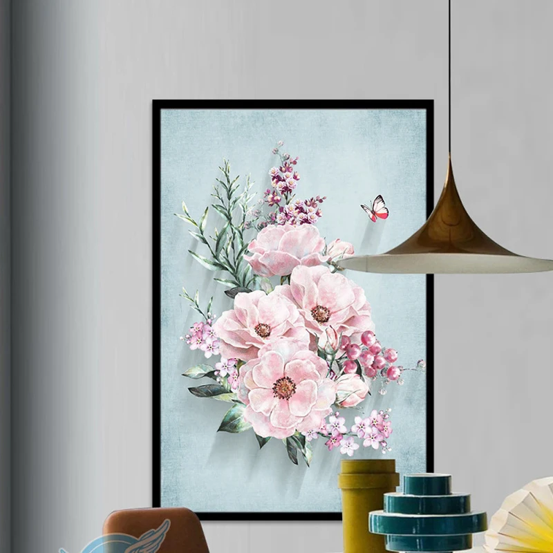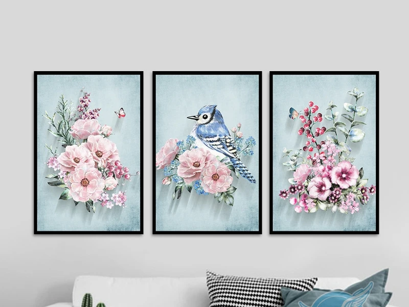Американский стиль, розовые цветы, Современное украшение, синие птицы, настенные художественные картины, холст, принт, живопись для гостиной, домашний декор, 4-57